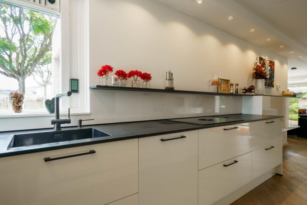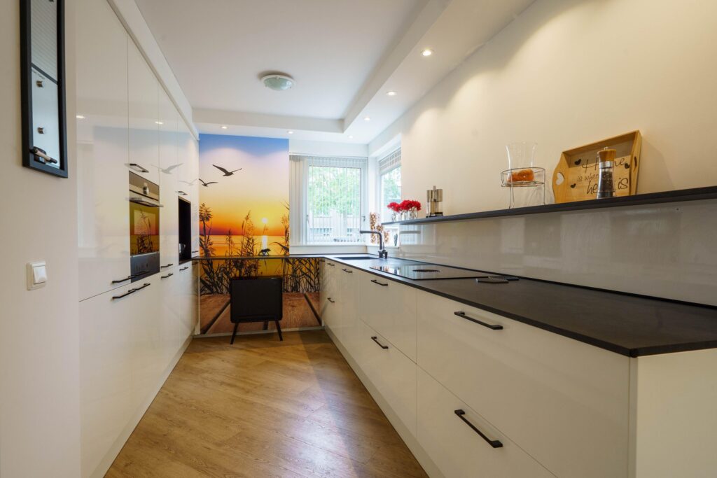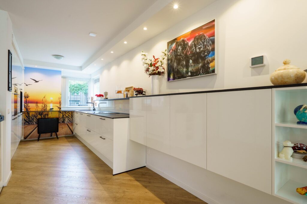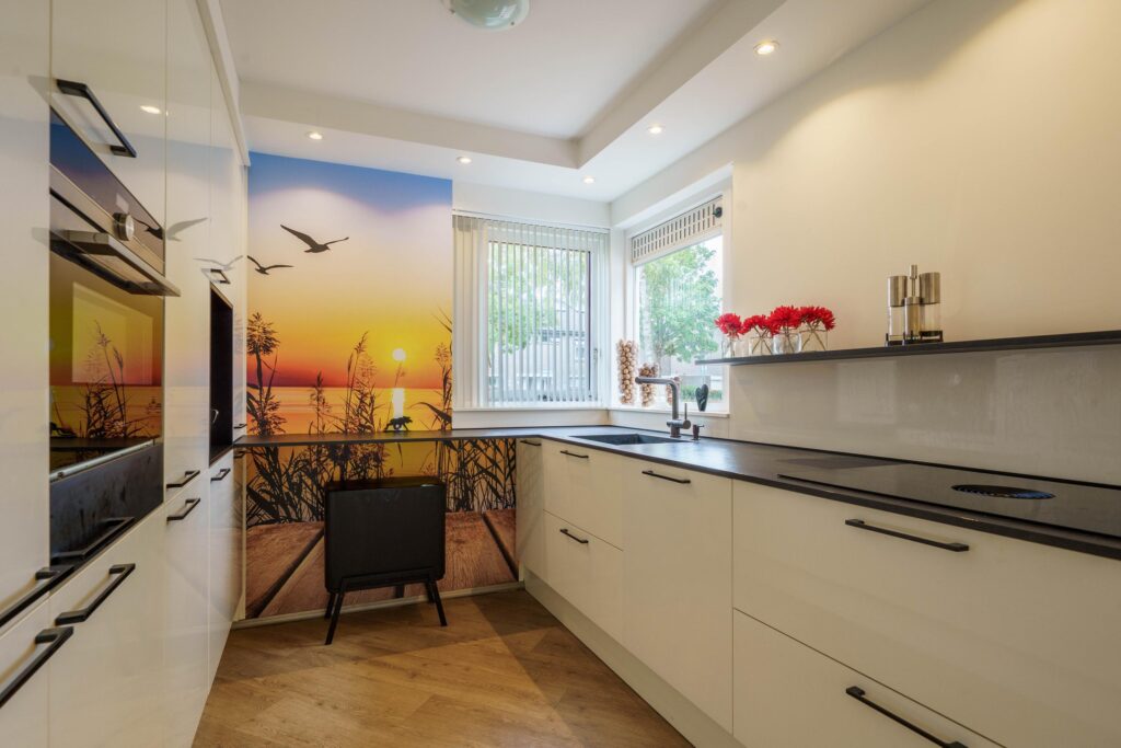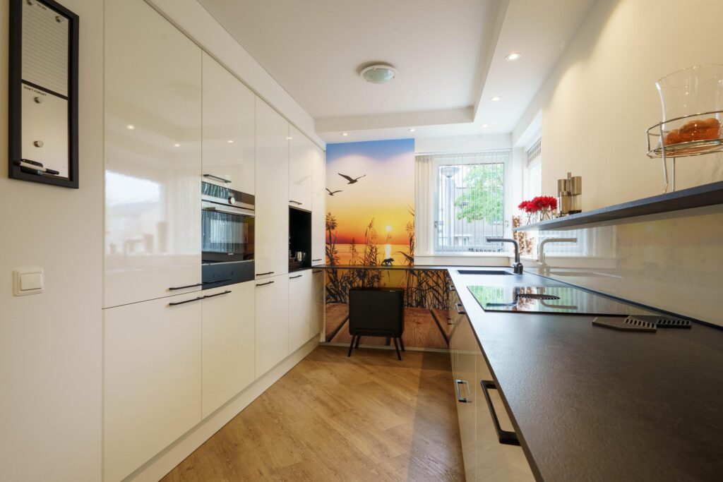 De half open keuken is aan de voorzijde gelegen en voorzien van een moderne inbouwkeuken (2021) bestaande uit een recht blok en een kastenwand. De keuken is voorzien van een koel-/vriescombinatie, vaatwasser, combimagnetron en een inductie kookplaat met geïntegreerde afzuiging. Tevens is er een ruime nis in de kastenwand om een koffieapparaat te plaatsen. Door de 2 grote ramen aan de voorzijde ook hier veel daglicht.