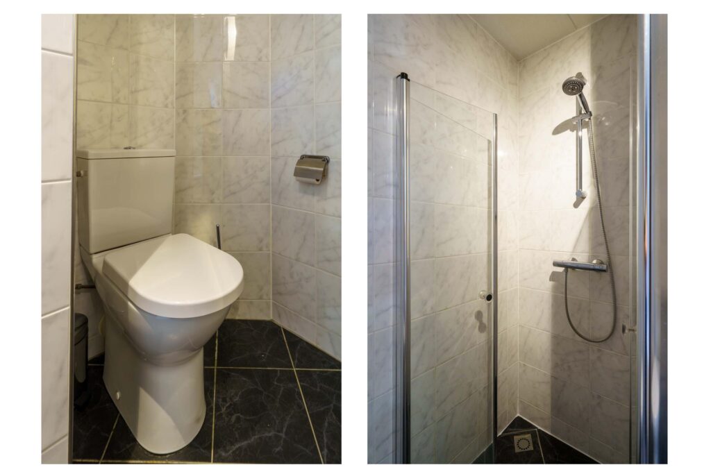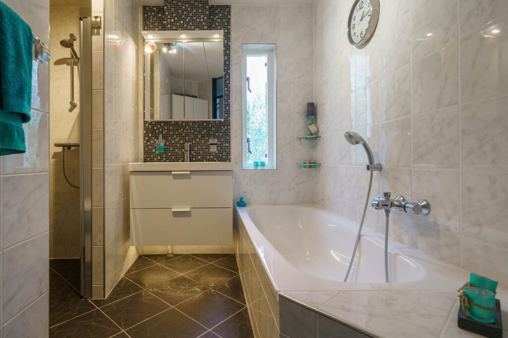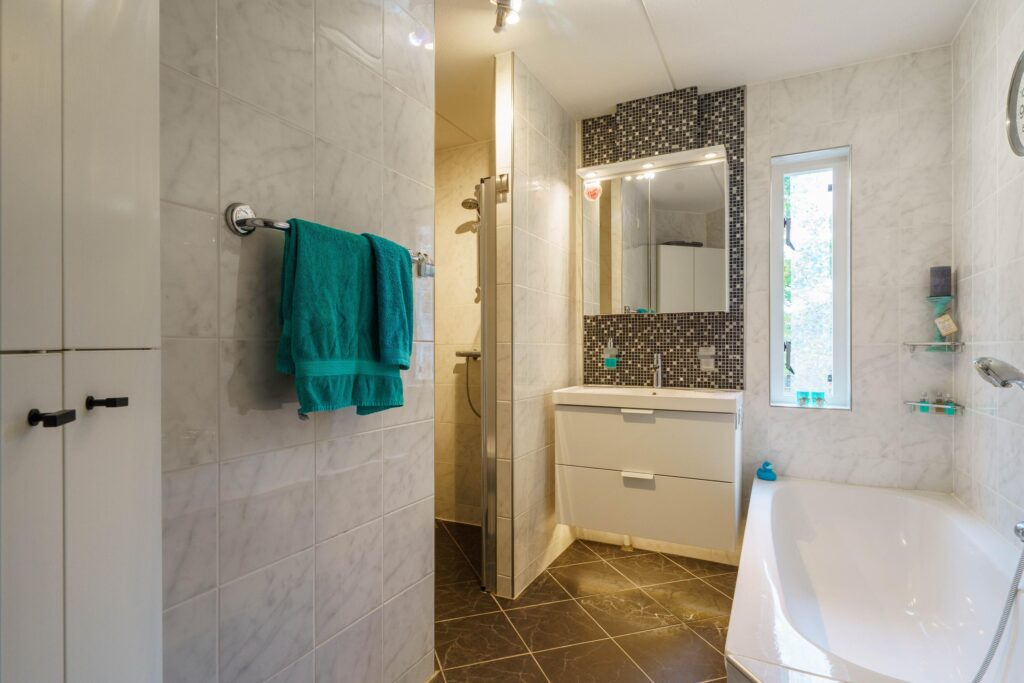 De badkamer is uitgevoerd met lichte betegeling en voorzien van een ligbad, royale inloopdouche, 2e toilet en een wastafel in meubel. Prettig is het raam in de zijgevel, hierdoor heeft u daglicht en kunt u optimaal ventileren.