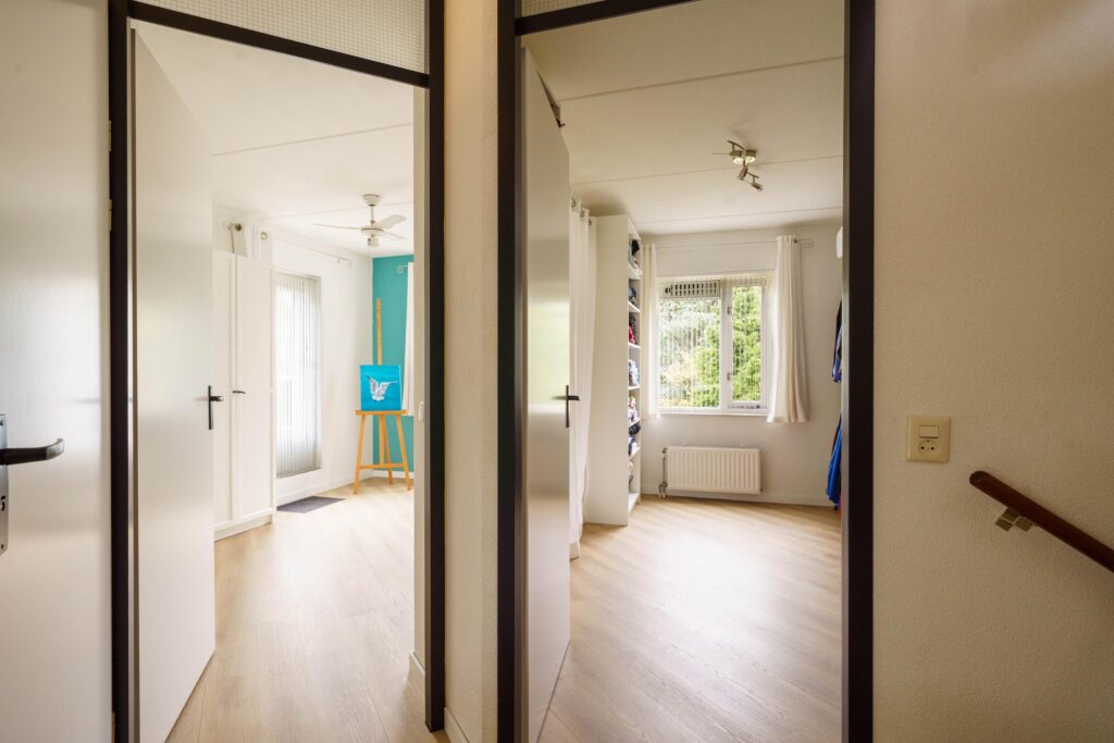 Hier bevindt zich een royale overloop met speelse indeling. U treft hier de toegang tot 3 slaapkamers en de badkamer. De slaapkamer aan de voorzijde is over de gehele breedte van de woning gelegen en heeft vaste kastenwand met schuifdeuren en een eigen balkon. Eén van de slaapkamers aan de achterzijde is v.v. een wastafelmeubel én heeft een eigen dakterras welke een fraai zicht biedt op de achtertuin en plantsoen aan de zijkant van de woning. De slaapkamers aan de achterzijde zijn op dit moment middels een toog met elkaar verbonden, dit kan echter eenvoudig weer worden dichtgemaakt.