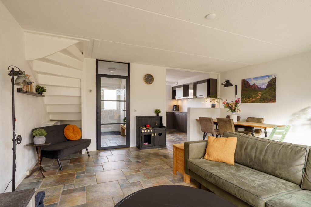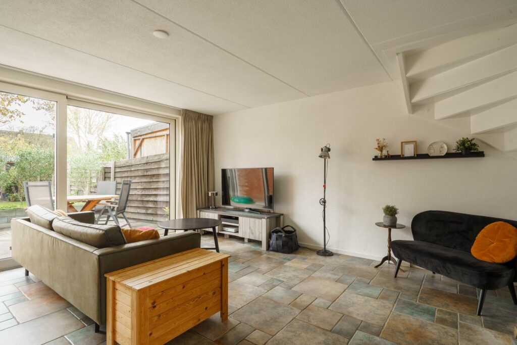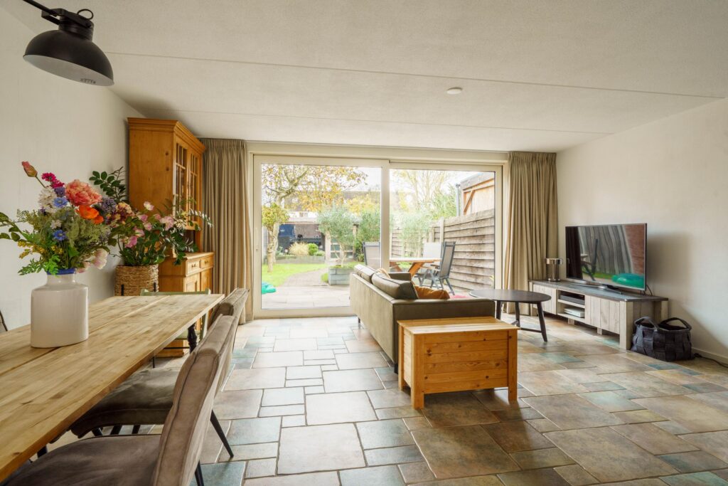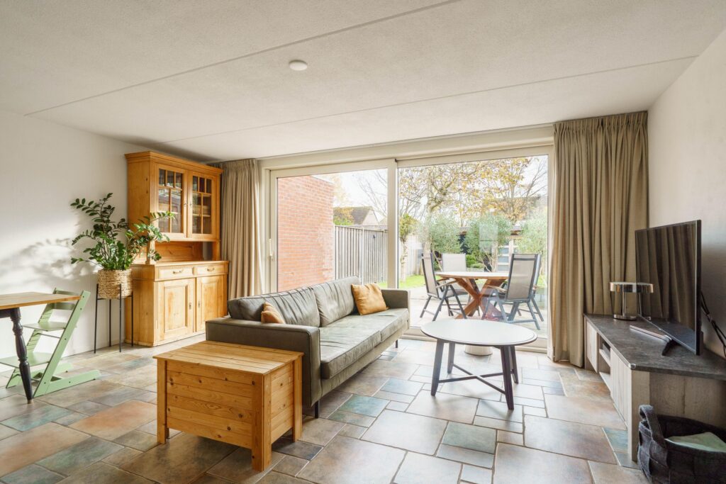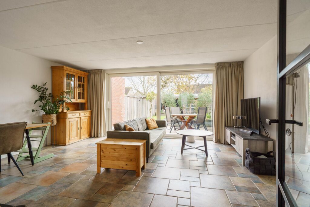 • Tuingerichte woonkamer met brede kunststof schuifpui