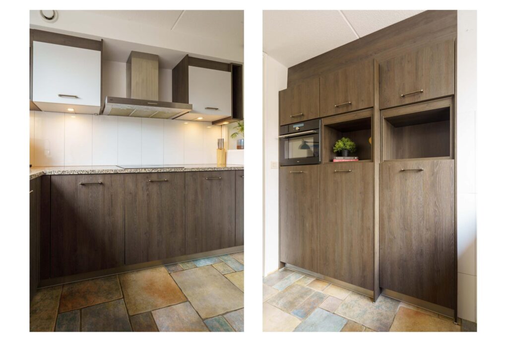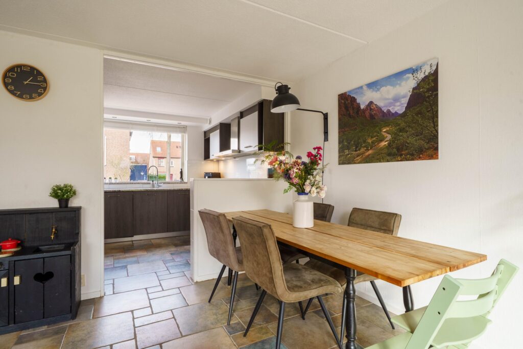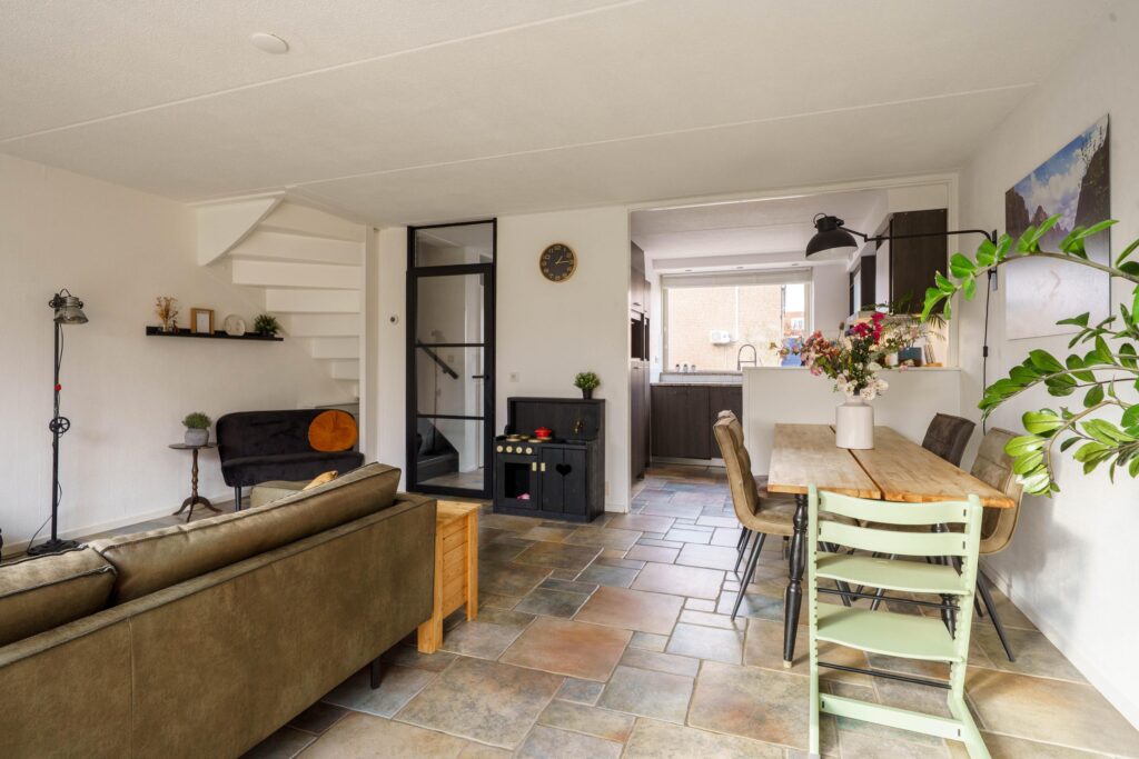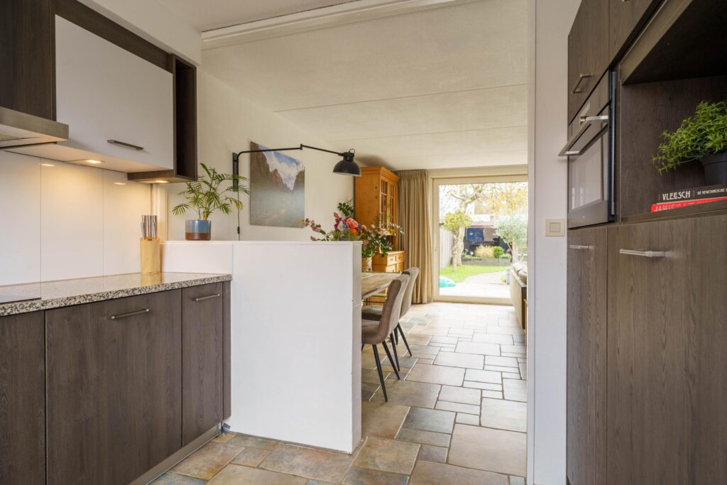 Aan de voorzijde ligt de keuken in U-opstelling met diverse apparatuur, voorzien van veel bergruimte en een groot raam dat veel daglicht binnenlaat. De begane grond is afgewerkt met plavuizen en vloerverwarming. De meterkast beschikt over een 3-fase aansluiting, ideaal voor het plaatsen van een laadpaal.