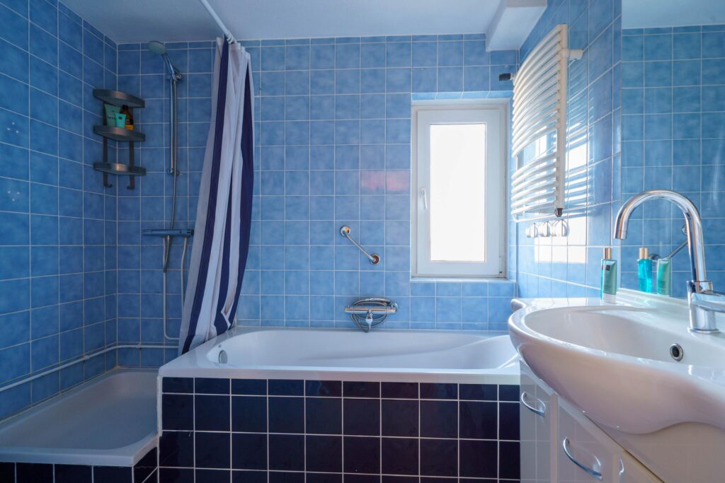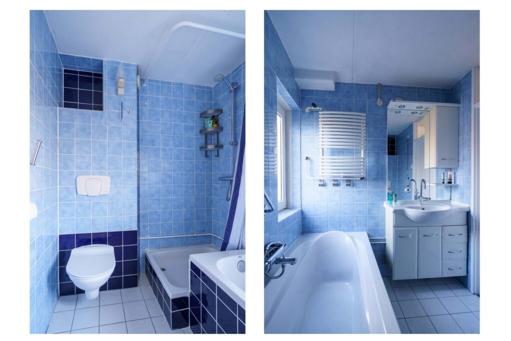 • Badkamer met douchehoek, ligbad, wastafelmeubel, 2e toilet en raam aan de voorzijde