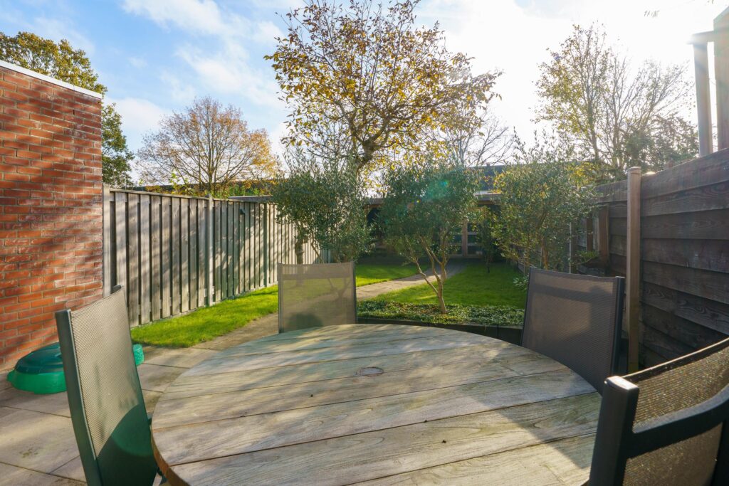 De achtertuin is bijna 20 meter diep, is gelegen op het zuidoosten, biedt veel privacy en is vrij gelegen. De tuin is ingericht met een groot terras aan de woning, gazon, verhoogde borders, overkapping, berging en beschikt over een achterom.
