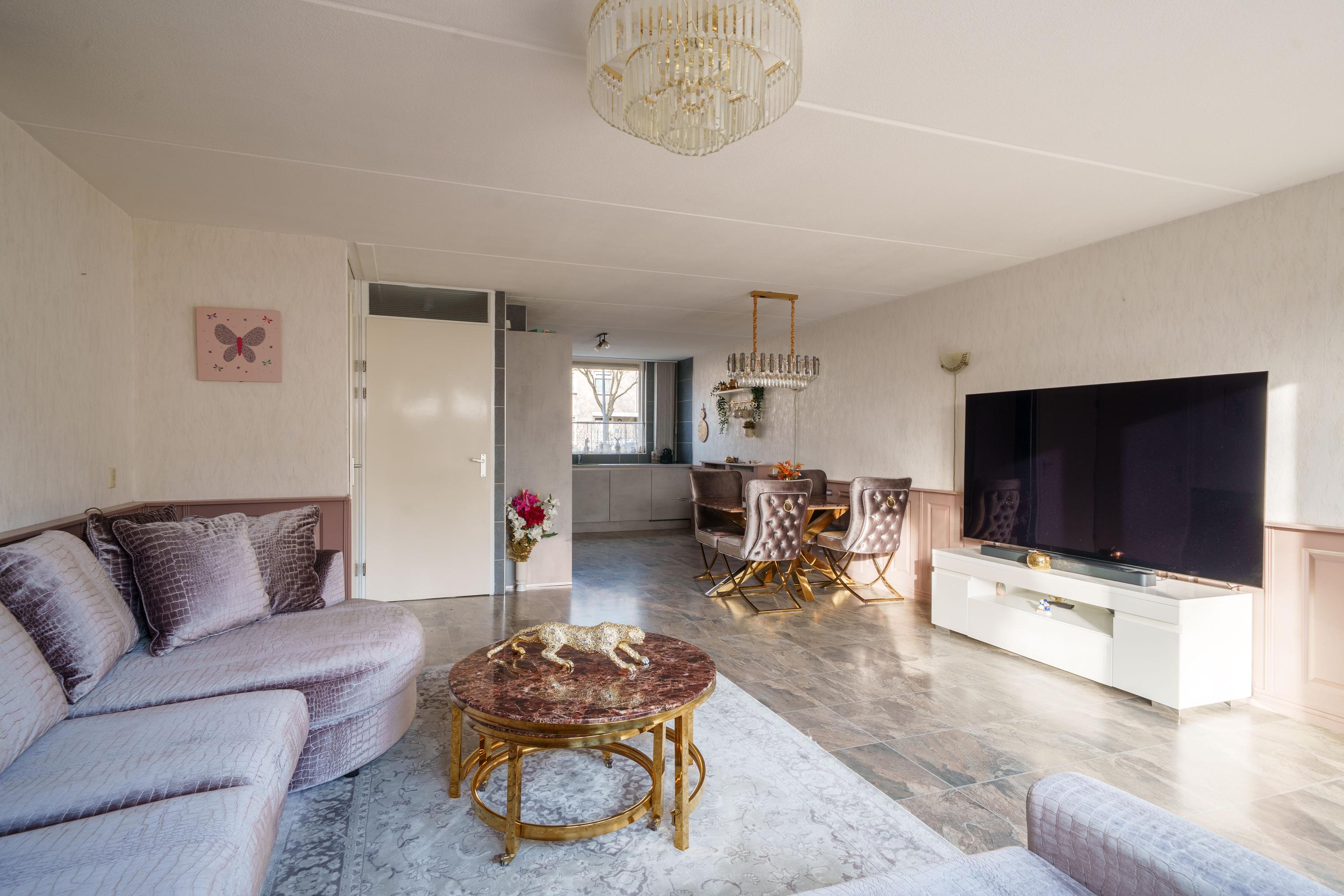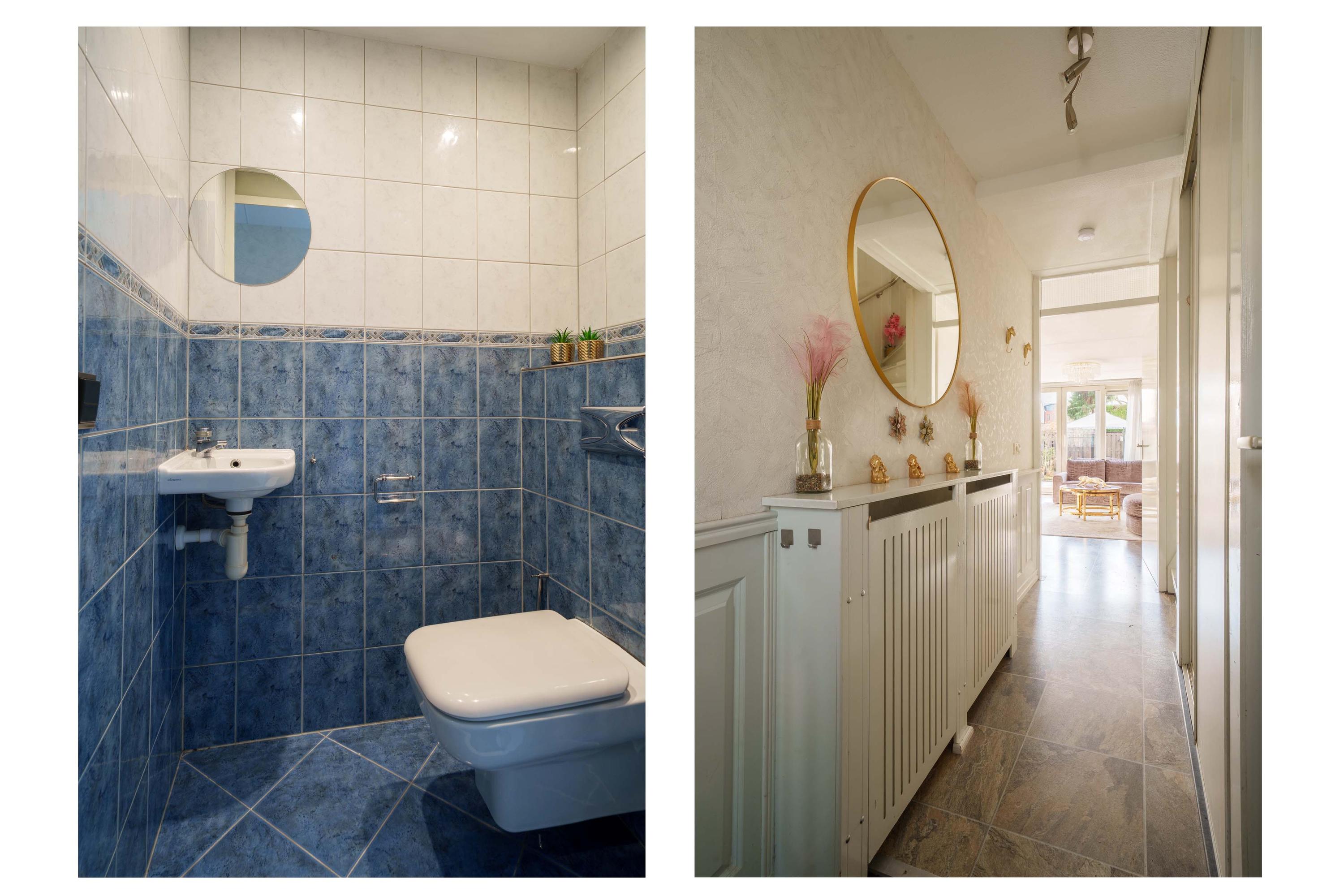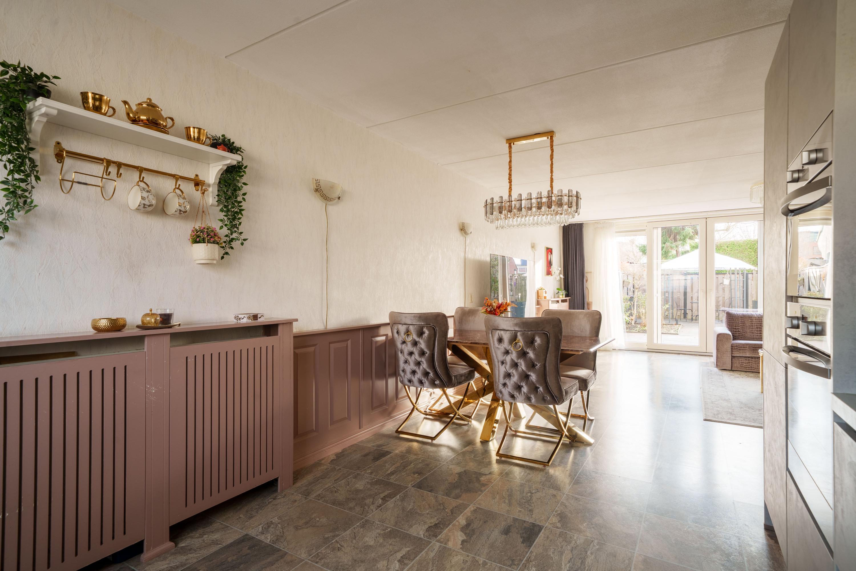 Via de voortuin bereikt u de entreehal met toilet, garderobe, meterkast en toegang tot de woonkamer. De woonkamer met uitzicht op de tuin is licht en luchtig dankzij de brede achtergevel met dubbele schuifdeuren.