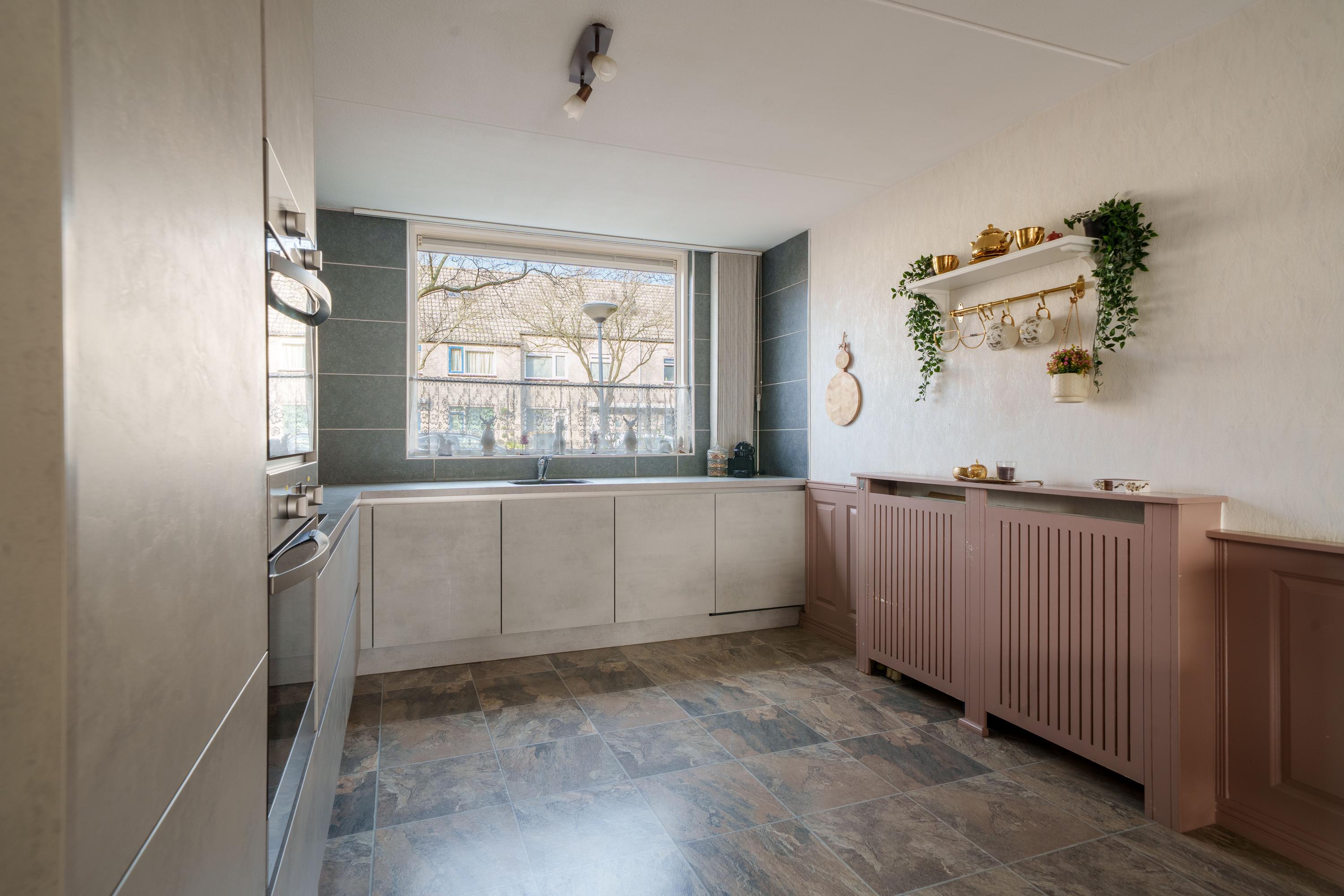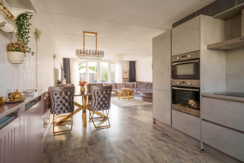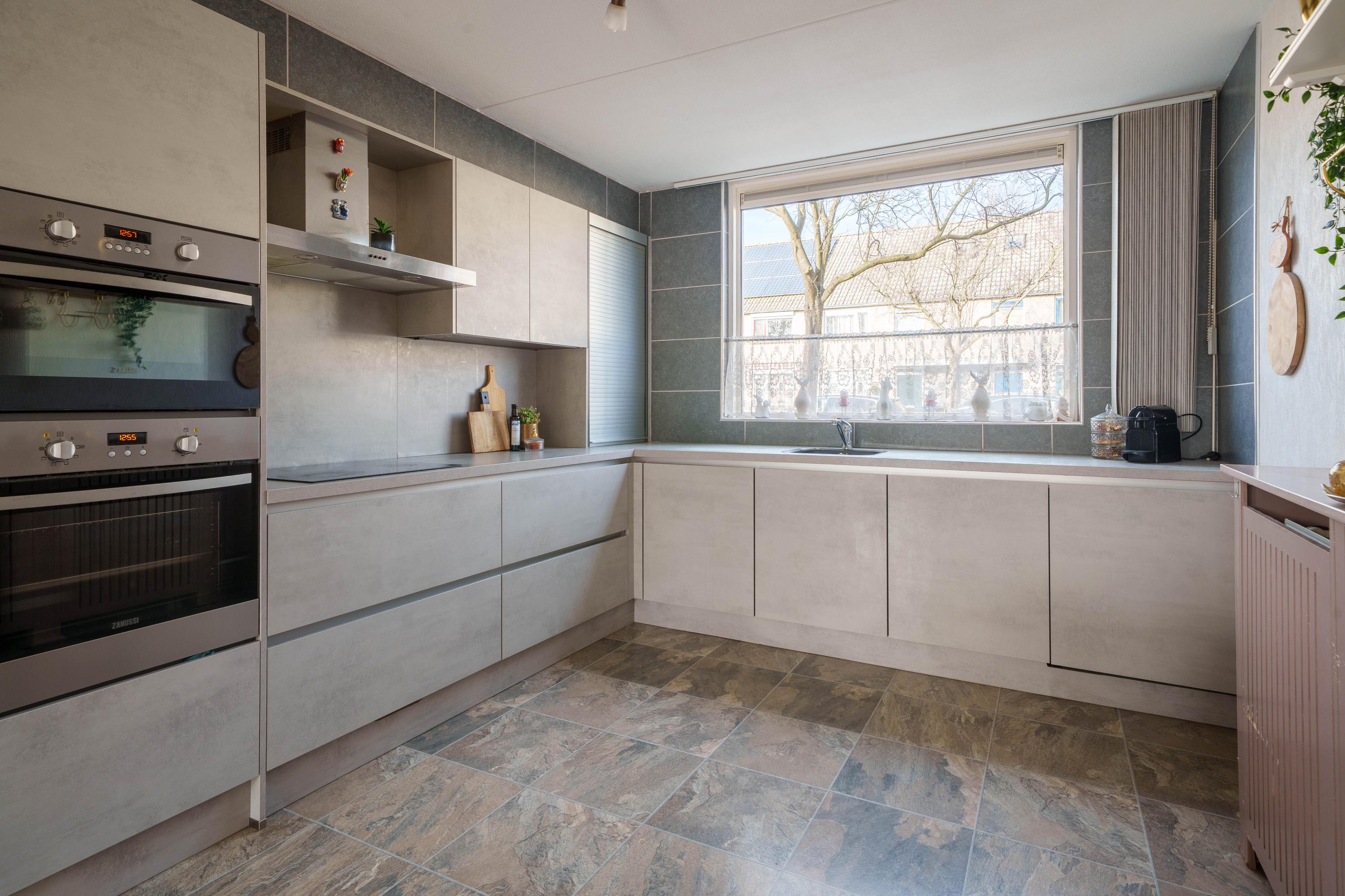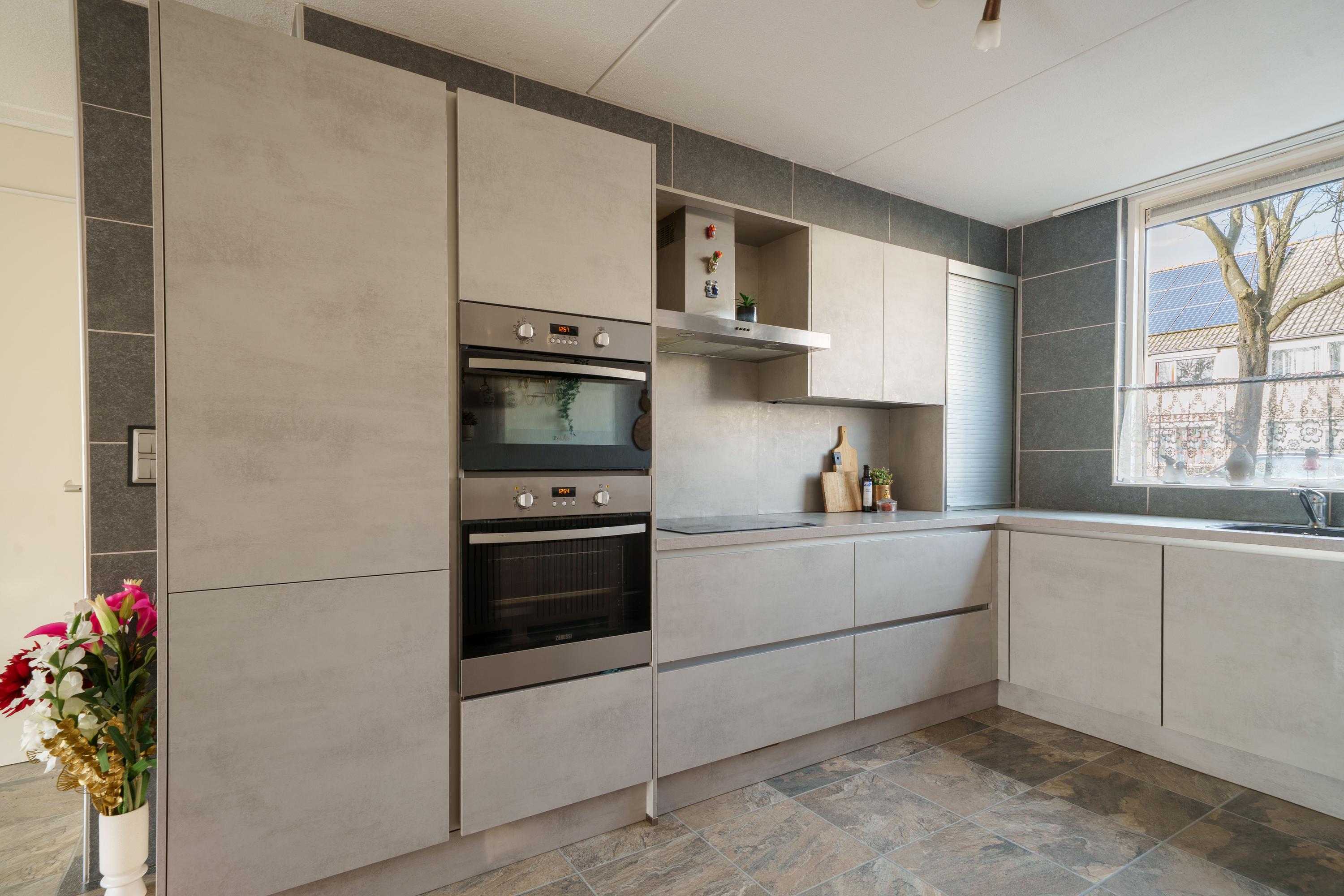 Aan de voorzijde van de woning bevindt zich de moderne L-vormige keuken (2018), compleet met koelkast/vriezer, vaatwasser, oven, combimagnetron, inductiekookplaat en roestvrijstalen afzuigkap.