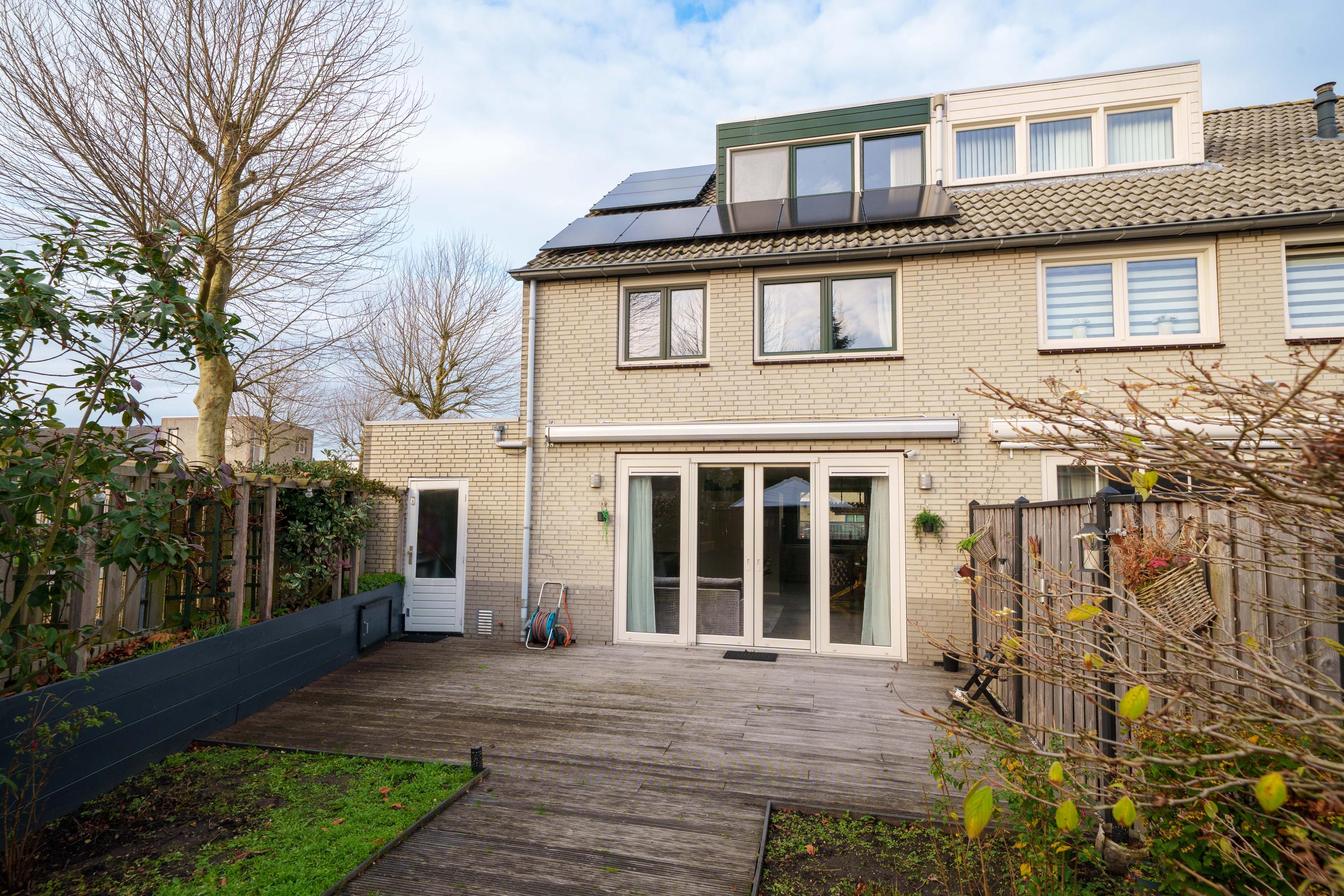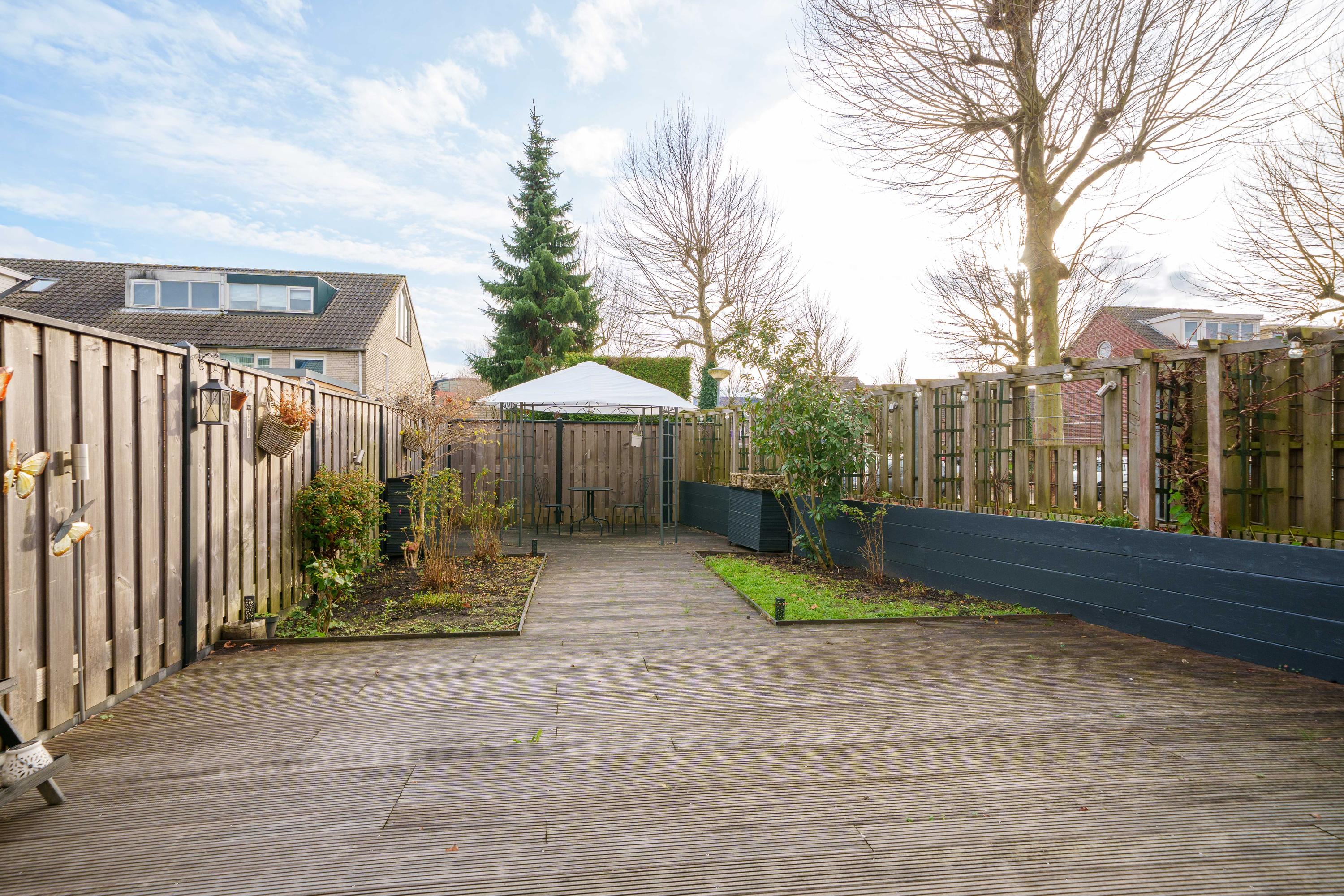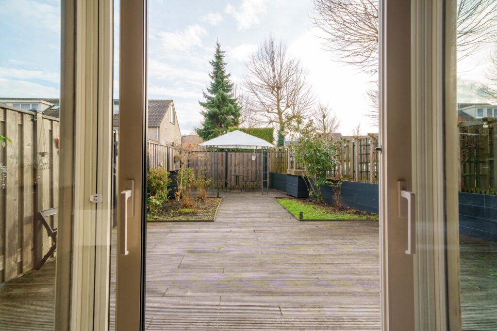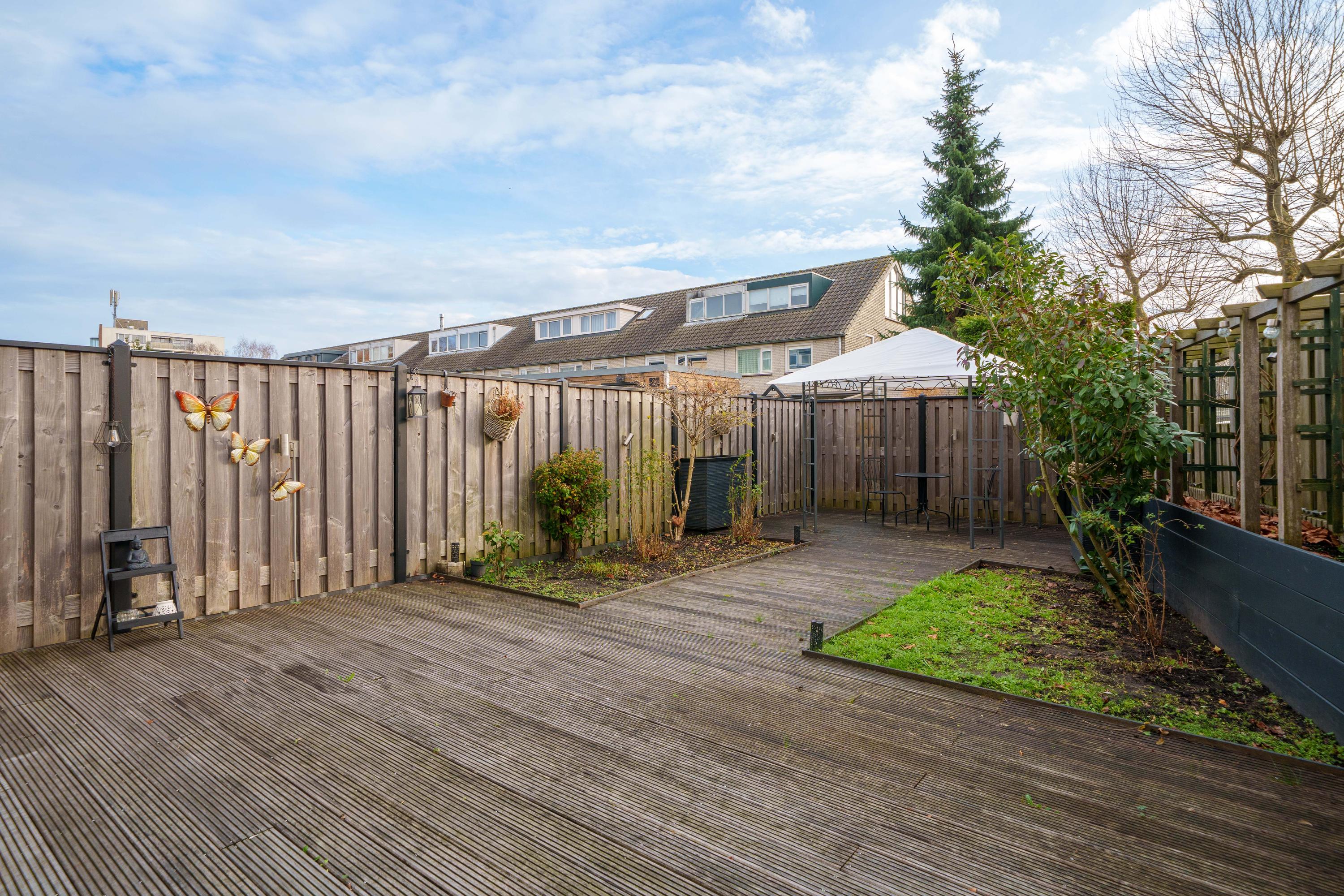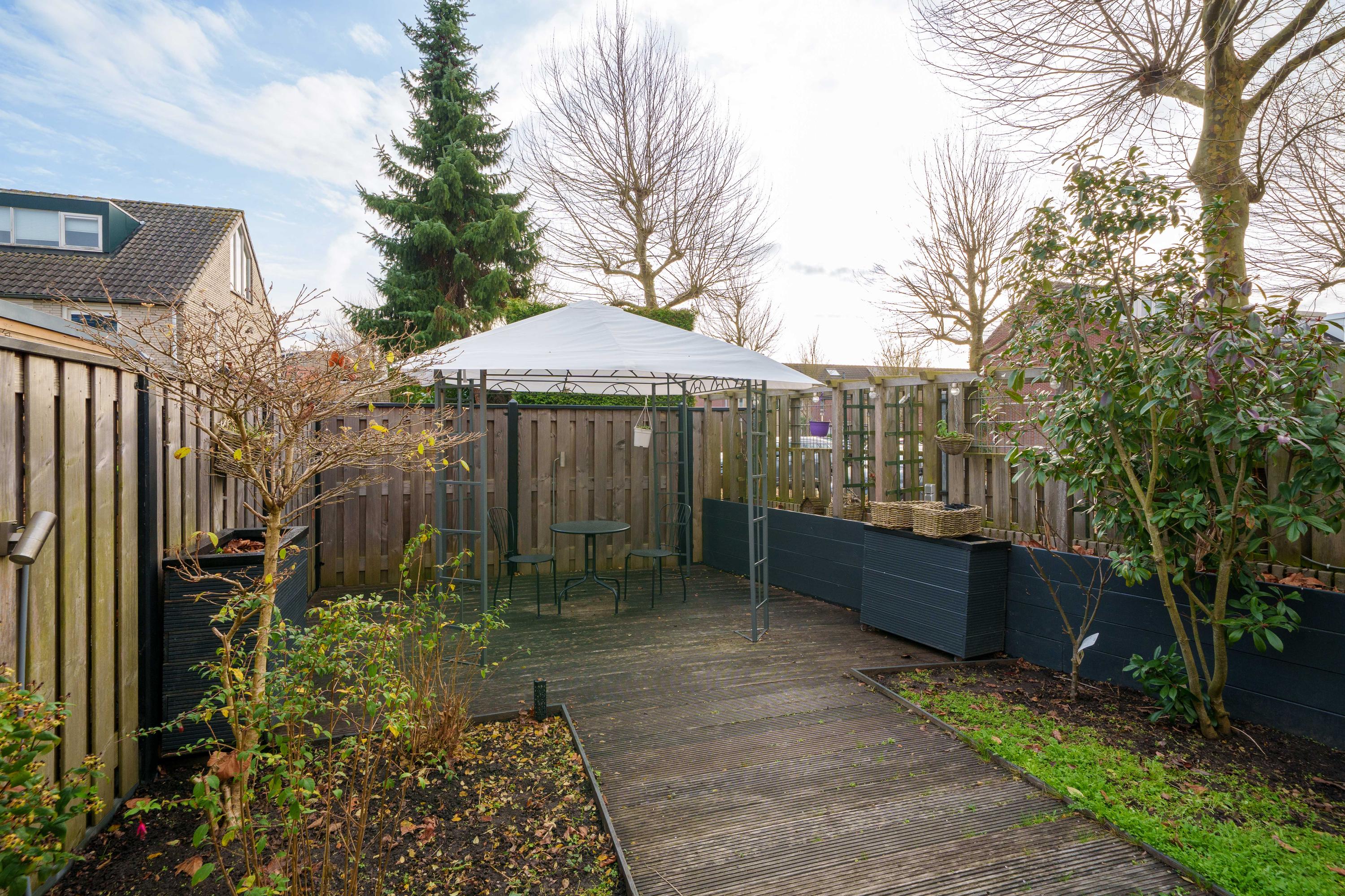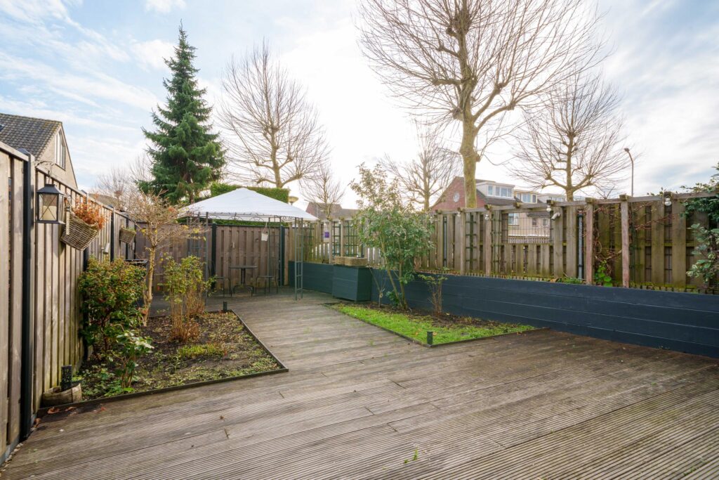 De zonnige achtertuin op het zuidoosten profiteert van zijn hoekligging en is in 2020 aangelegd. Hij beschikt over twee terrassen met houten vlonders, veel groen, verhoogde borders, buitenstopcontacten en een kraan. Een luifel zorgt voor schaduw en de tuin is gemakkelijk toegankelijk via de garage.