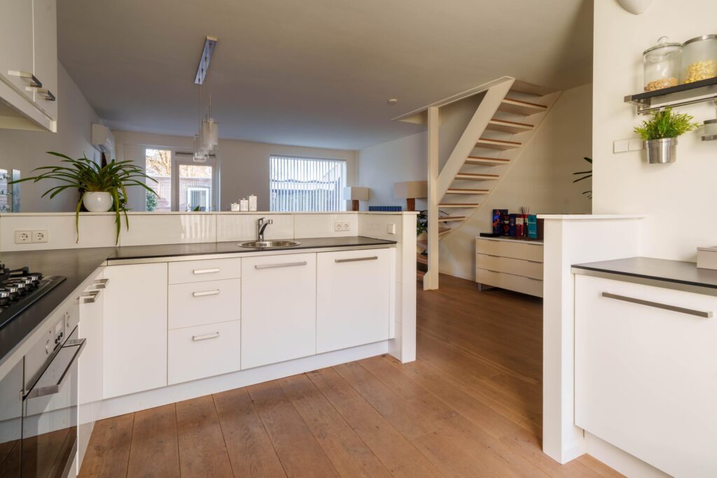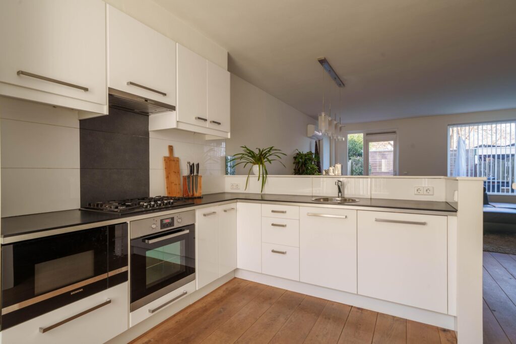 • Moderne inbouwkeuken in L-opstelling (voorzijde) v.v. alle wenselijke apparatuur: koel-/vriescombinatie, vaatwasser, combimagnetron, oven, brede 5-pits gaskookplaat met wokbrander, vlakzuigscherm met gevelafvoer