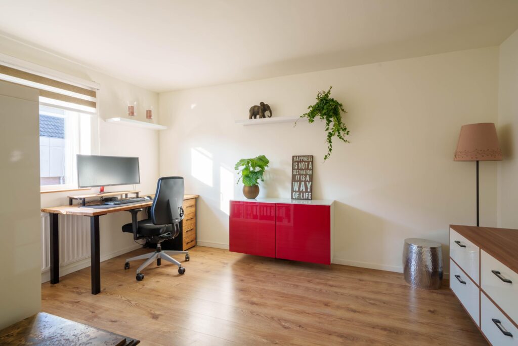 Overloop met aansluitingen voor wasmachine/droger en toegang tot 2 extra slaapkamers. De slaapkamer aan de achterzijde is voorzien van een dakkapel, 2 handige inbouwkasten en een cv-/bergkast (Remeha Tzerra uit 2014). Verwarming middels een infraroodpaneel boven de werkplek. De slaapkamer aan de voorzijde biedt middels een luik met vlizotrap toegang tot de bergvliering. In beide slaapkamers heeft u bergruimte achter de knieschotten welke middels schuifdeuren toegankelijk zijn.