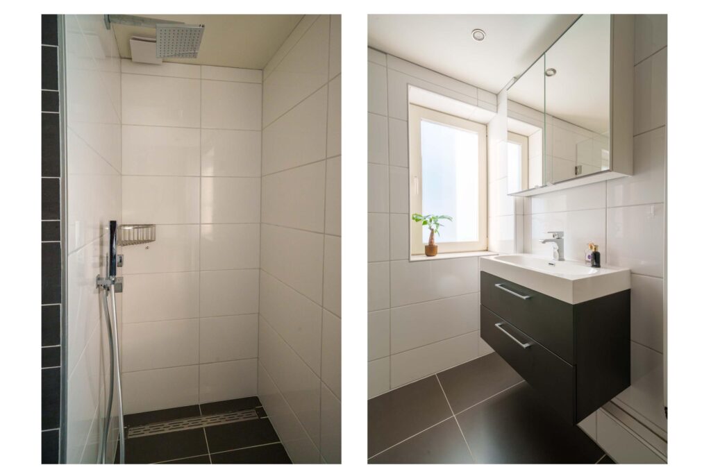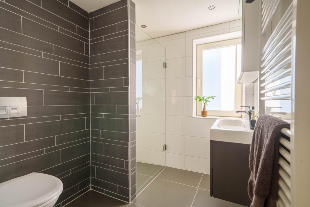 • Moderne badkamer met douchecabine, 2e toilet, wastafelmeubel, designradiator, tot plafond betegeld, verlaagd plafond met inbouwverlichting en raam aan de voorzijde