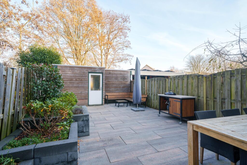 De achtertuin is volledig aangelegd met sierbestrating en voorzien van enkele (verhoogde) borders met groen. Tevens treft u hier 2 buitenkranen en elektrapunten. Achter in de tuin bevindt zich een ruime garage/werkplaats over de gehele breedte van het perceel, aan de voorzijde voorzien van een elektrische sectionaaldeur. Uiteraard beschikt deze eveneens over een toegangsdeur vanuit de tuin.