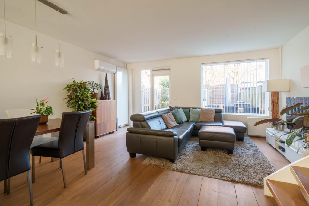 Entreehal met meterkast, toiletruimte en toegang tot de tuingerichte woonkamer. De woonkamer is licht en ruim door grote raampartijen en voorzien van airco. De moderne L-vormige keuken bevindt zich aan de voorzijde en is uitgerust met alle wenselijke inbouwapparatuur. In de keuken ook veel lichtinval door het grote raam. De begane grond is voorzien van houten vloerdelen, de wanden en het plafond zijn glad gestuukt. Via de open trap in de woonkamer gaat naar de 1e verdieping.