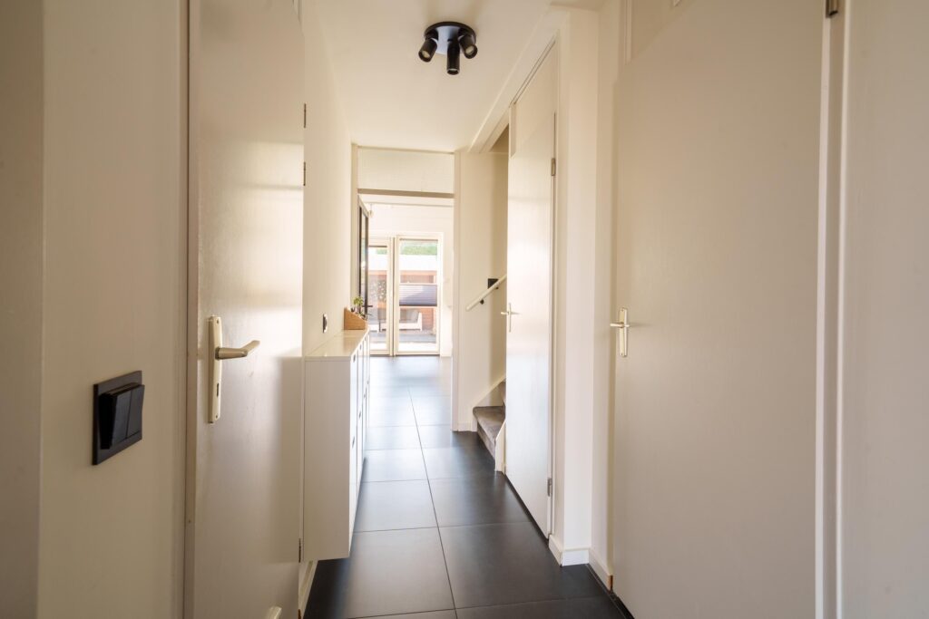Entree met hal, toilet, wasruimte, trapkast en trapopgang naar de eerste verdieping. Vanuit de hal is tevens de inpandige garage bereikbaar.