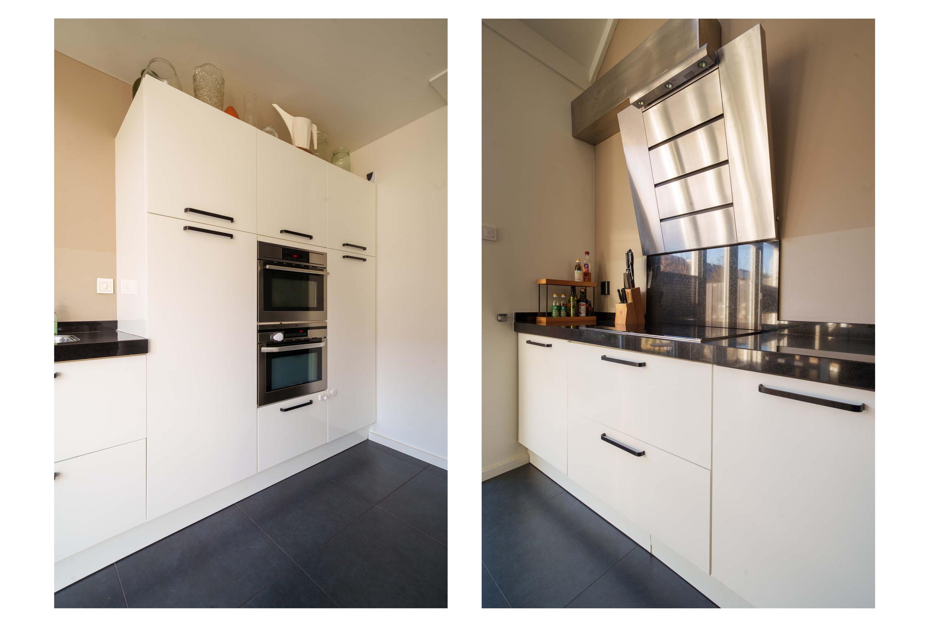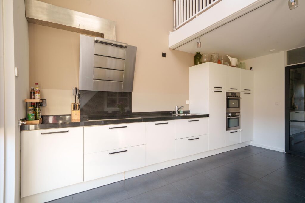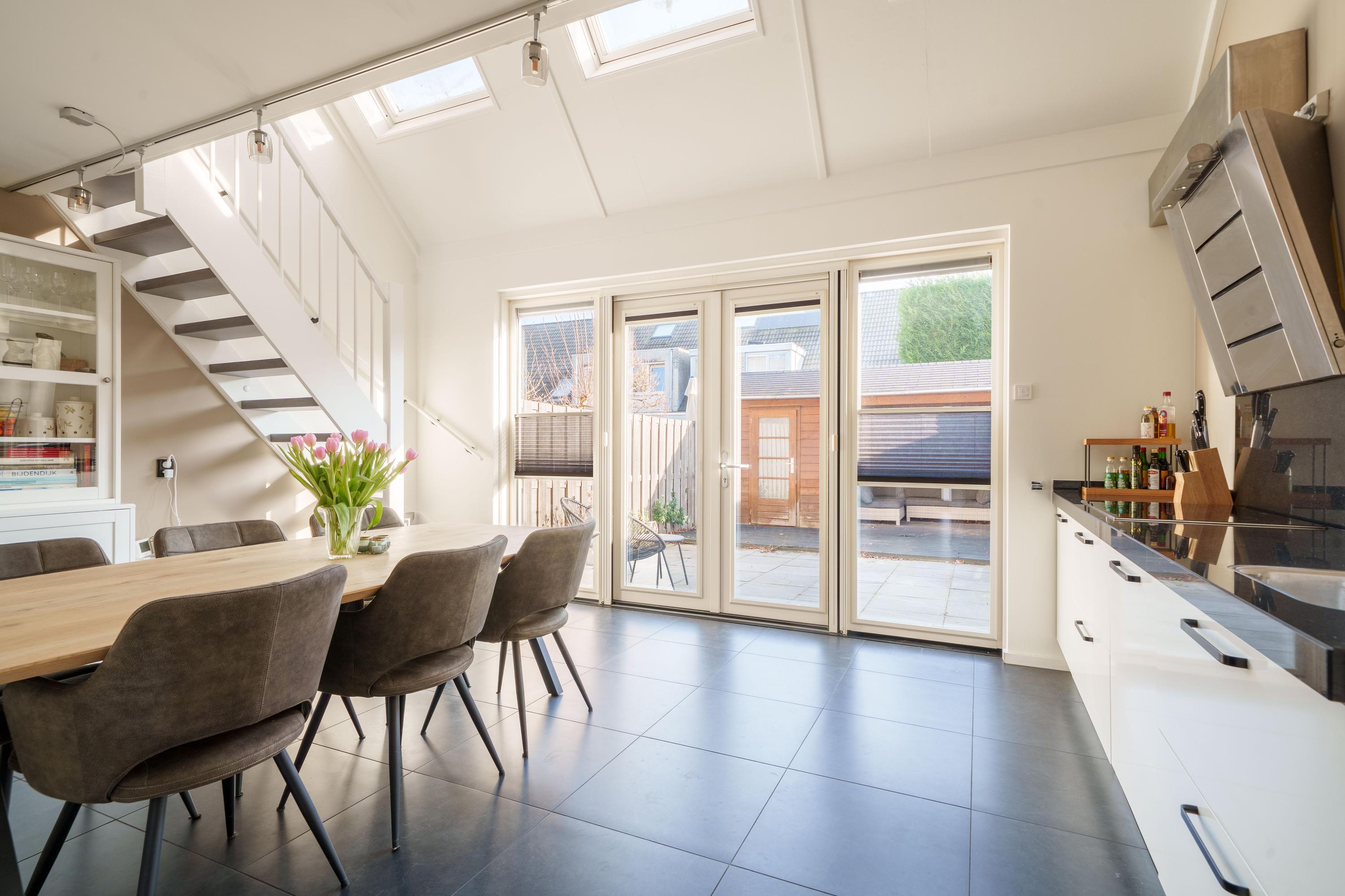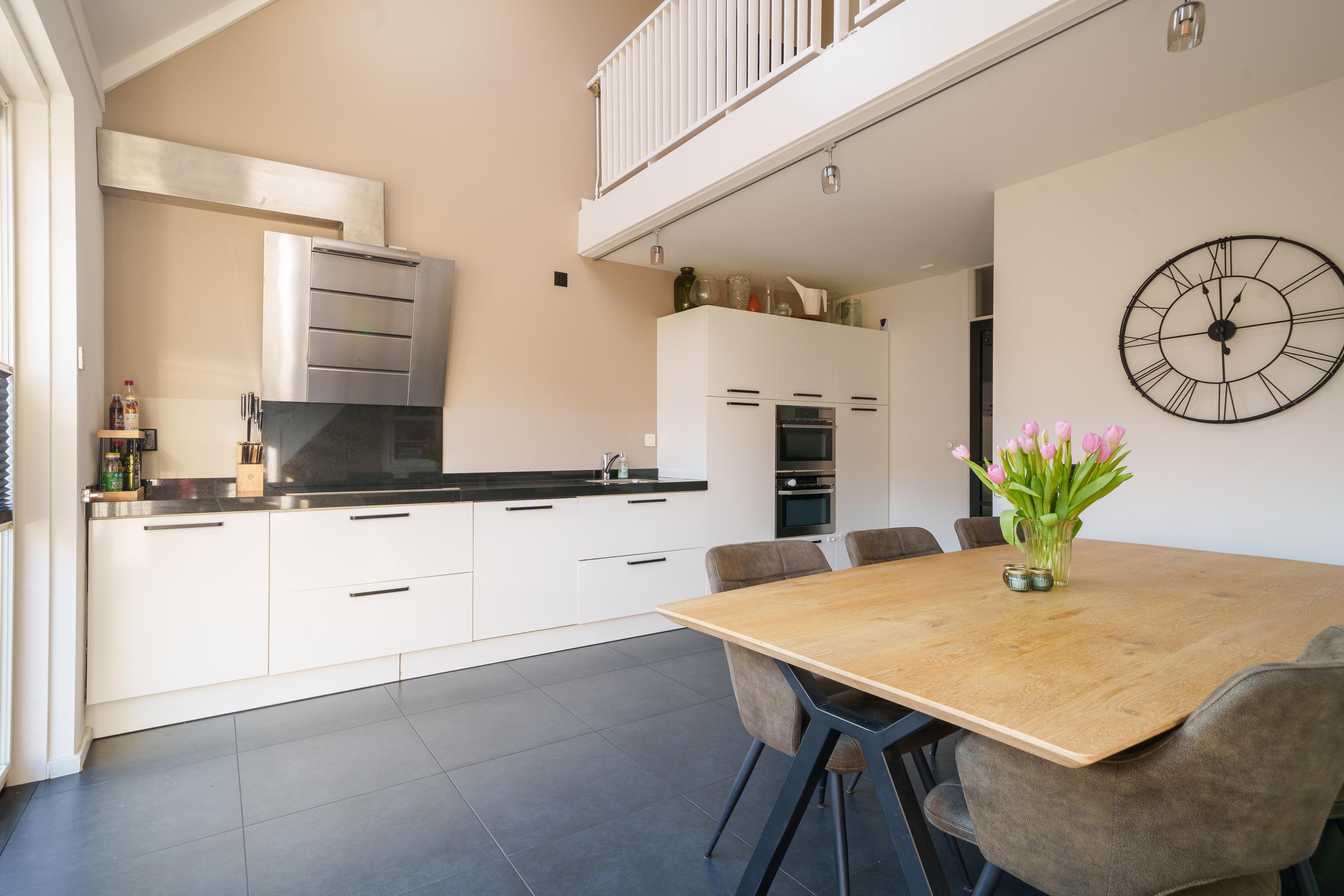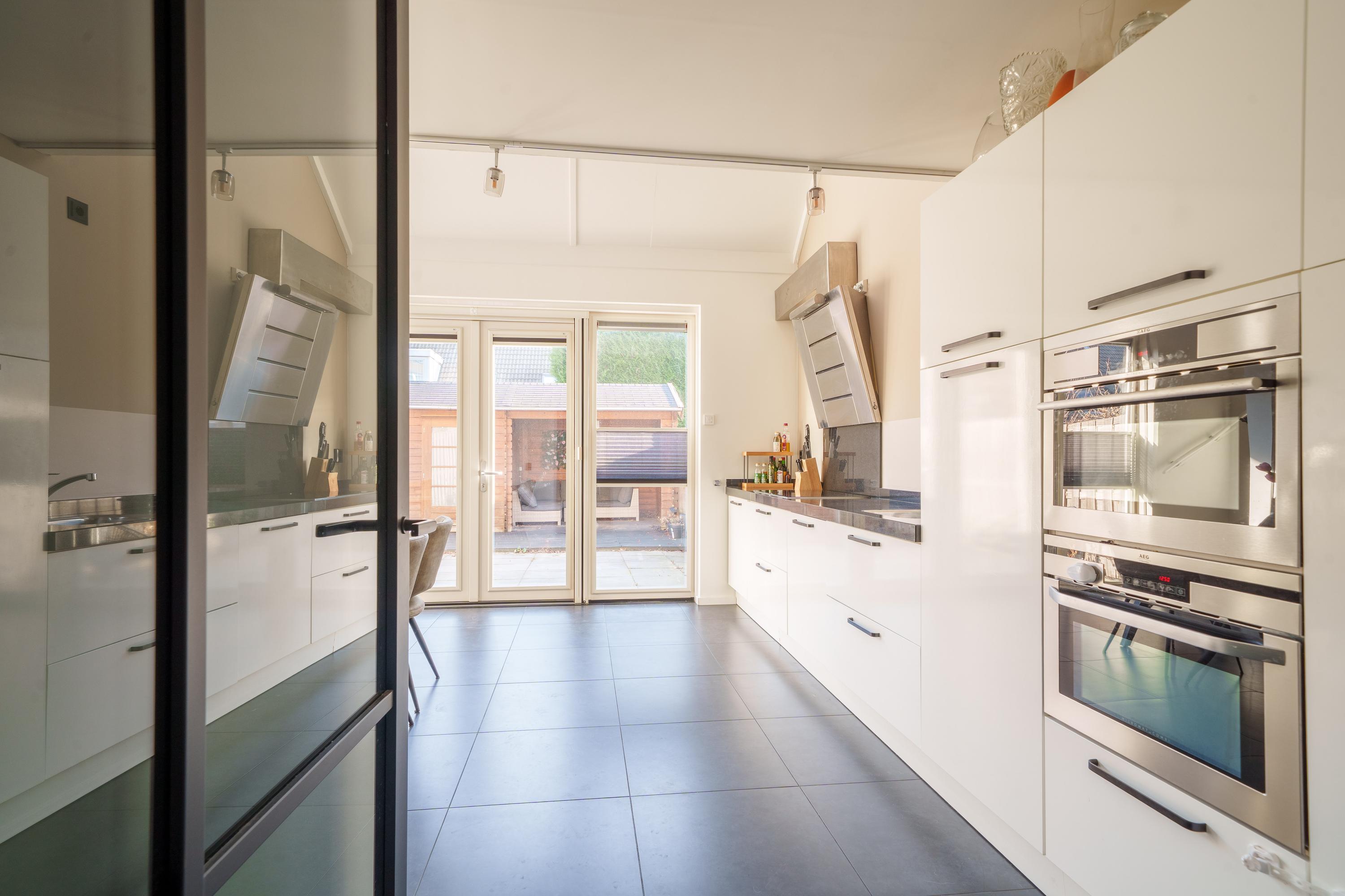 Via een tussendeur kom je in de royale en lichte woonkeuken. Deze is uitgevoerd met een complete inbouwkeuken voorzien van onder andere een inductiekookplaat, afzuigkap, vaatwasser, koelkast, vriezer en twee combimagnetrons. De brede glazen pui met openslaande deuren zorgt voor veel lichtinval en directe toegang tot de zonnige achtertuin.