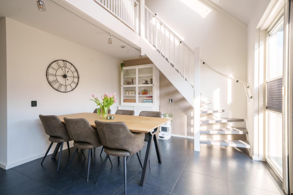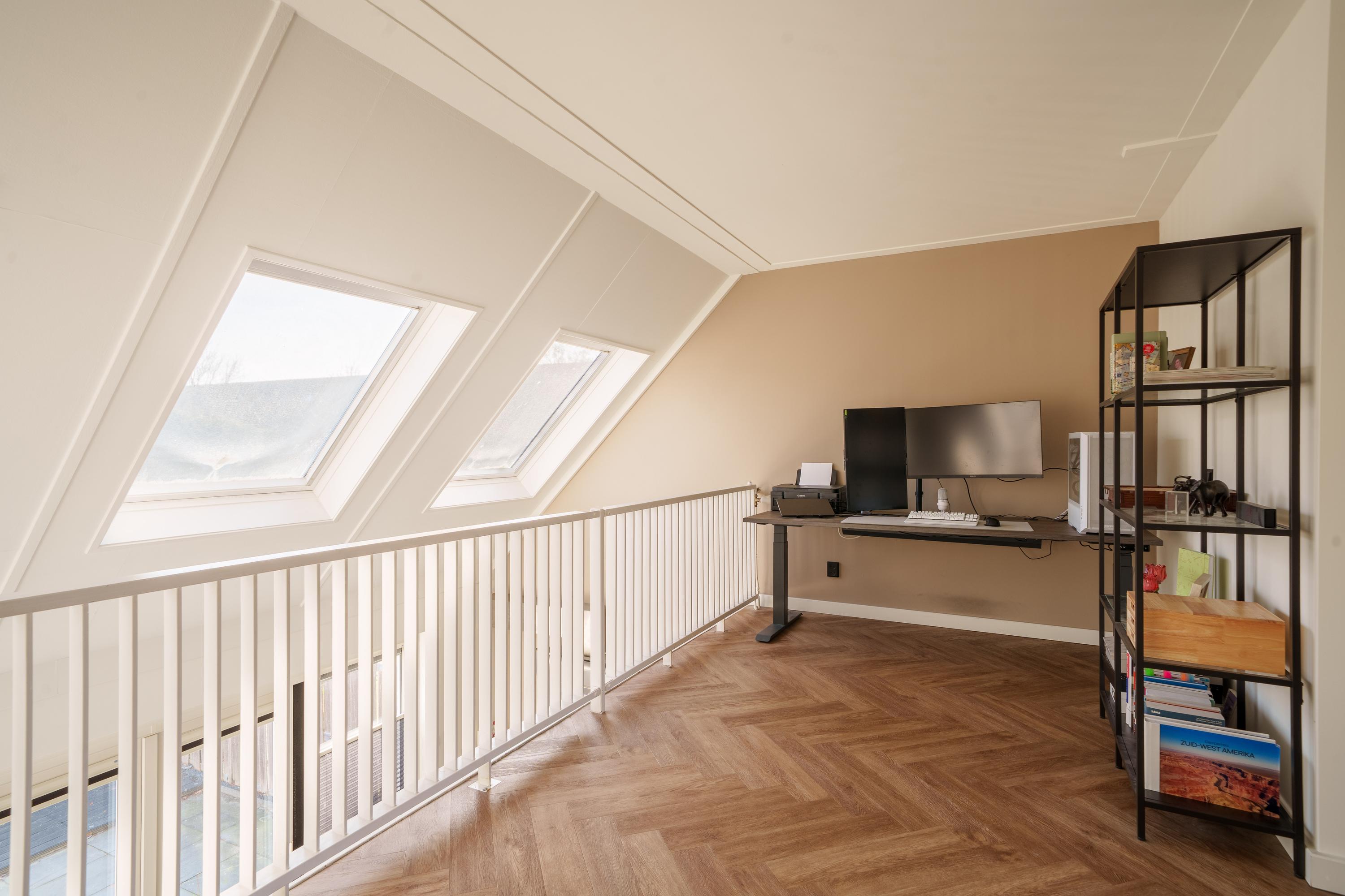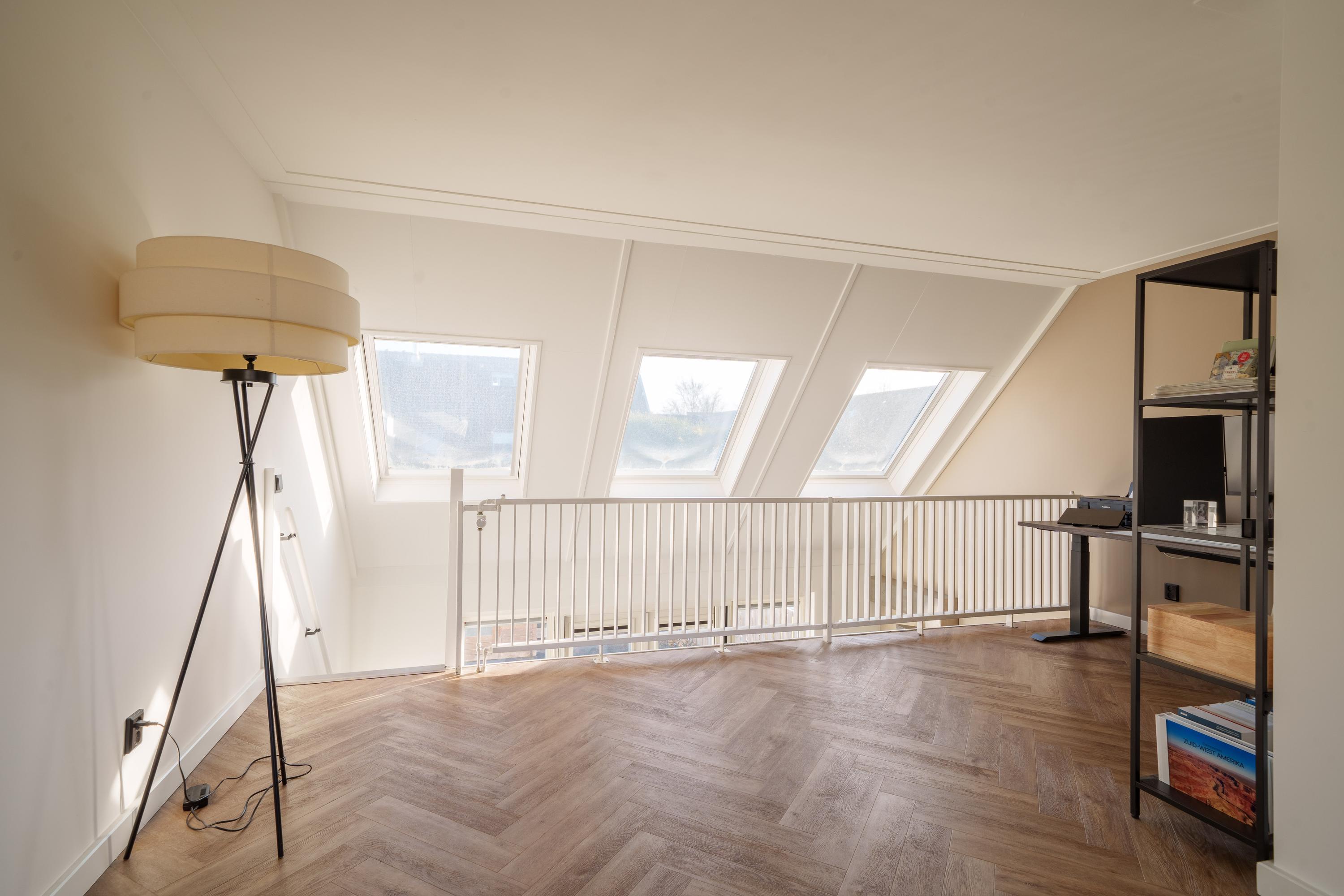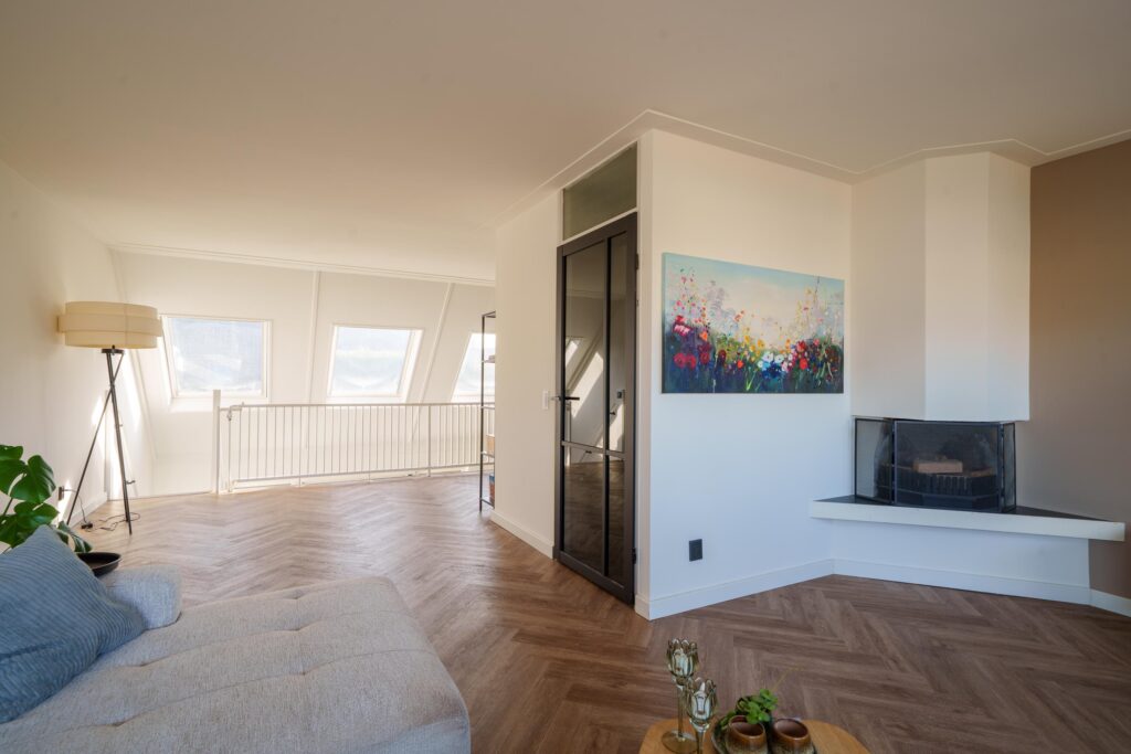 Op deze verdieping bevindt zich de sfeervolle woonkamer met vide en balustrade, wat zorgt voor een speelse indeling en extra ruimtelijk gevoel. De open haard vormt een gezellig middelpunt van de woonkamer. De vloer is afgewerkt met pvc.