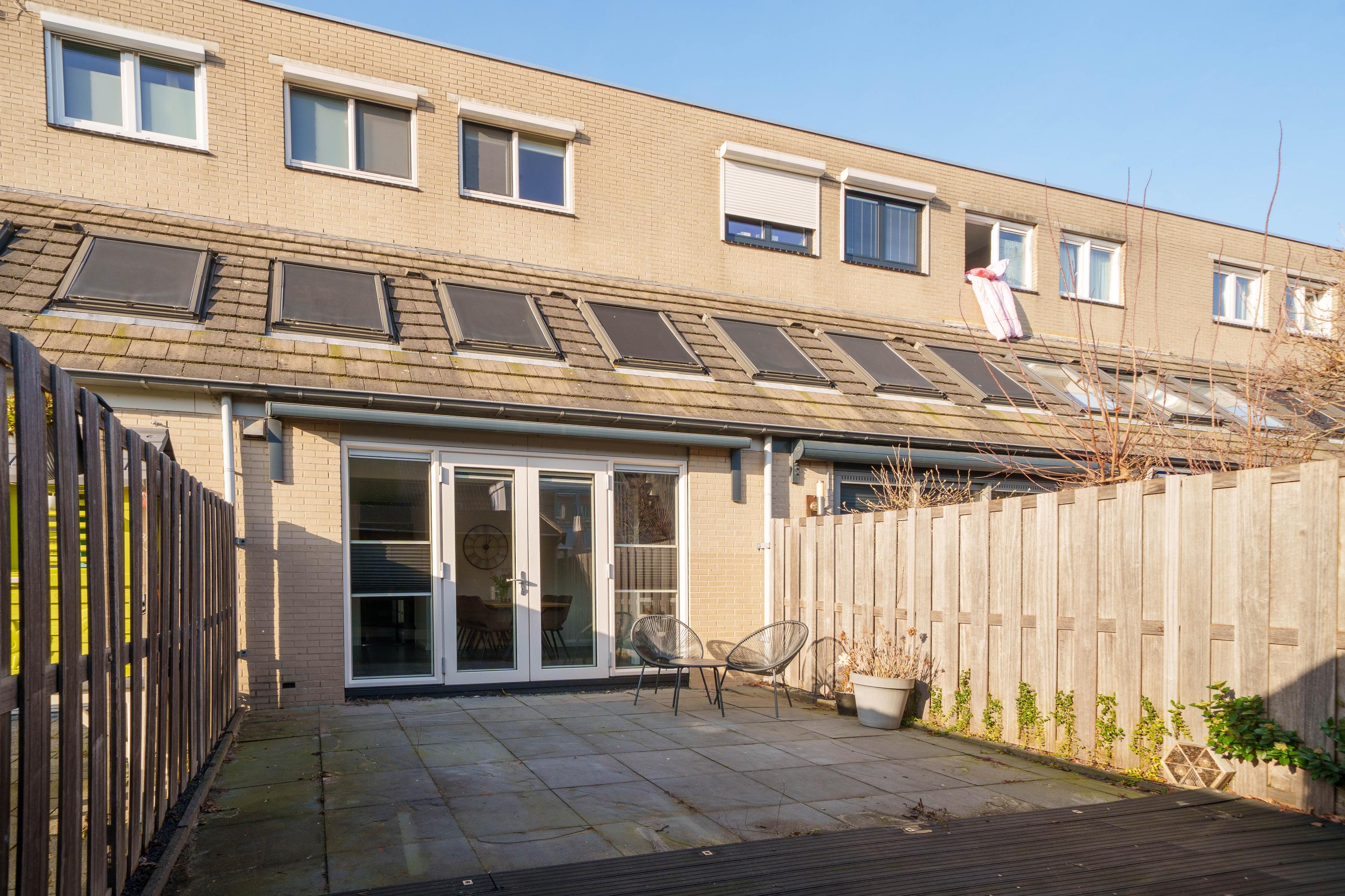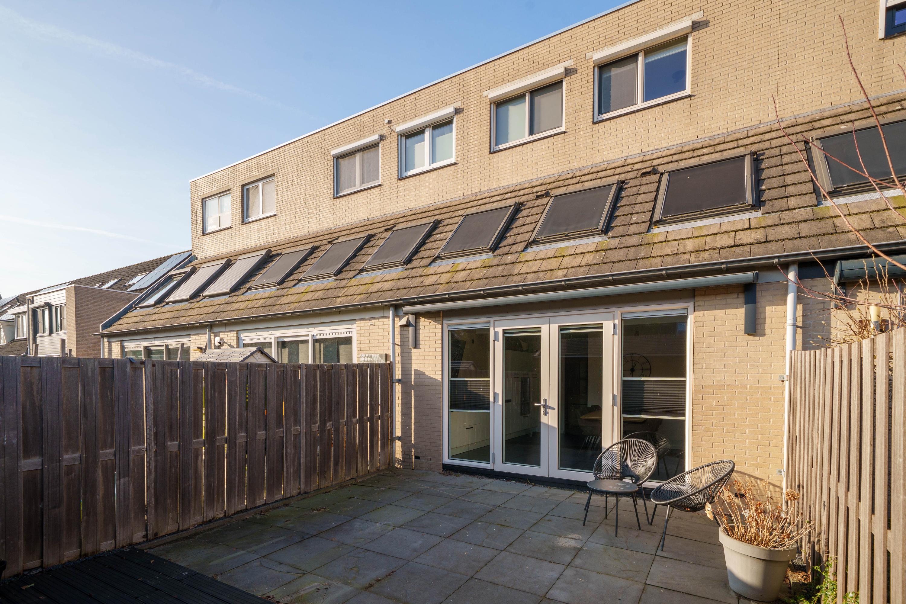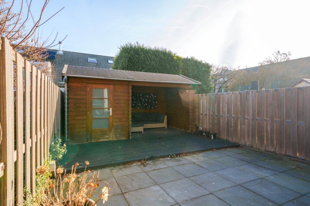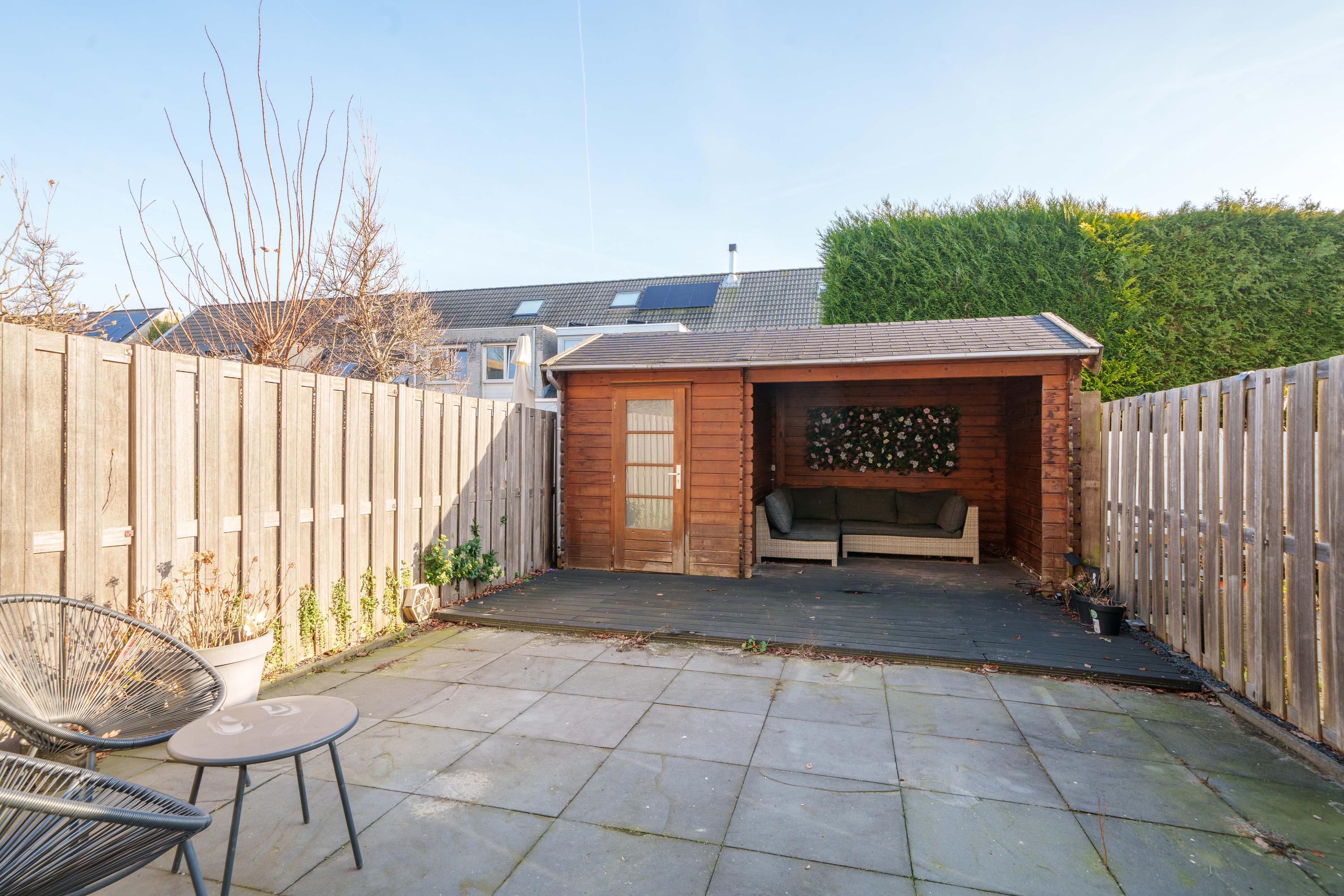 De achtertuin is gelegen op het zuidoosten en is onderhoudsvriendelijk aangelegd met sierbestrating. Achter in de tuin bevindt zich een houten berging met een sfeervolle overkapping, ideaal voor extra opslag en een beschutte zitplek.