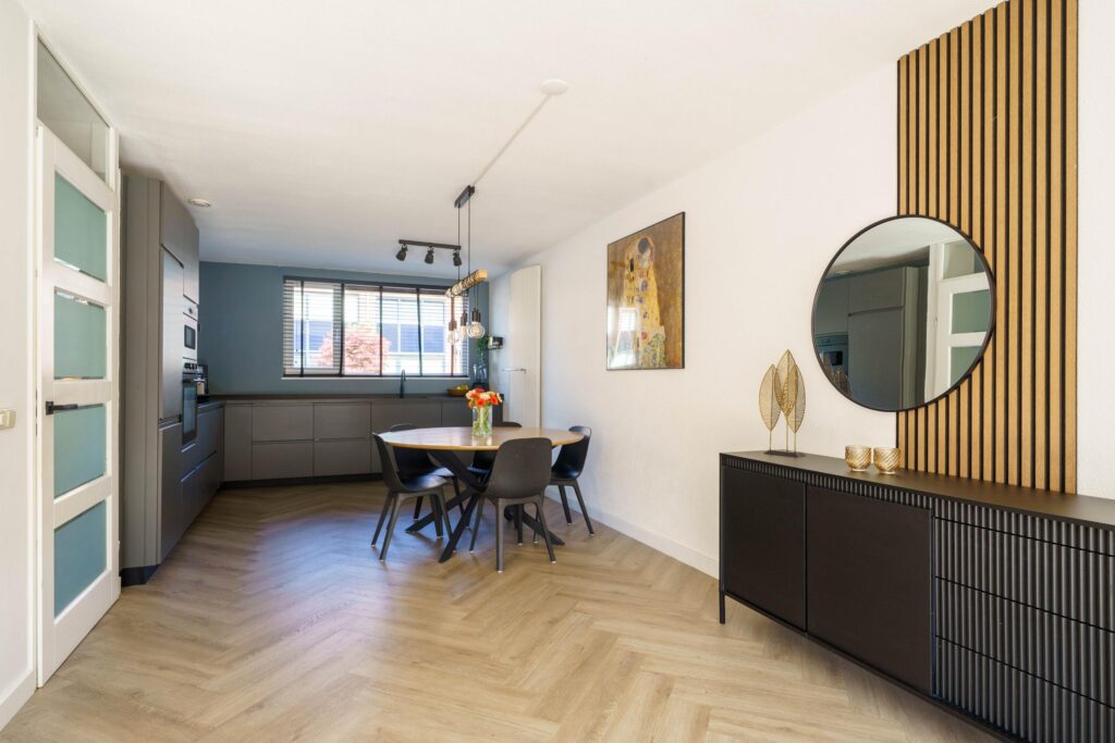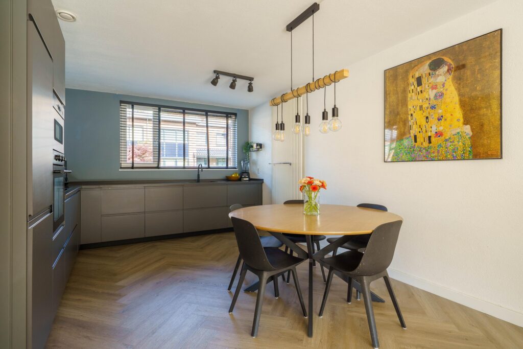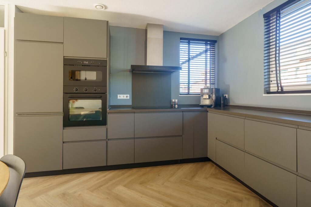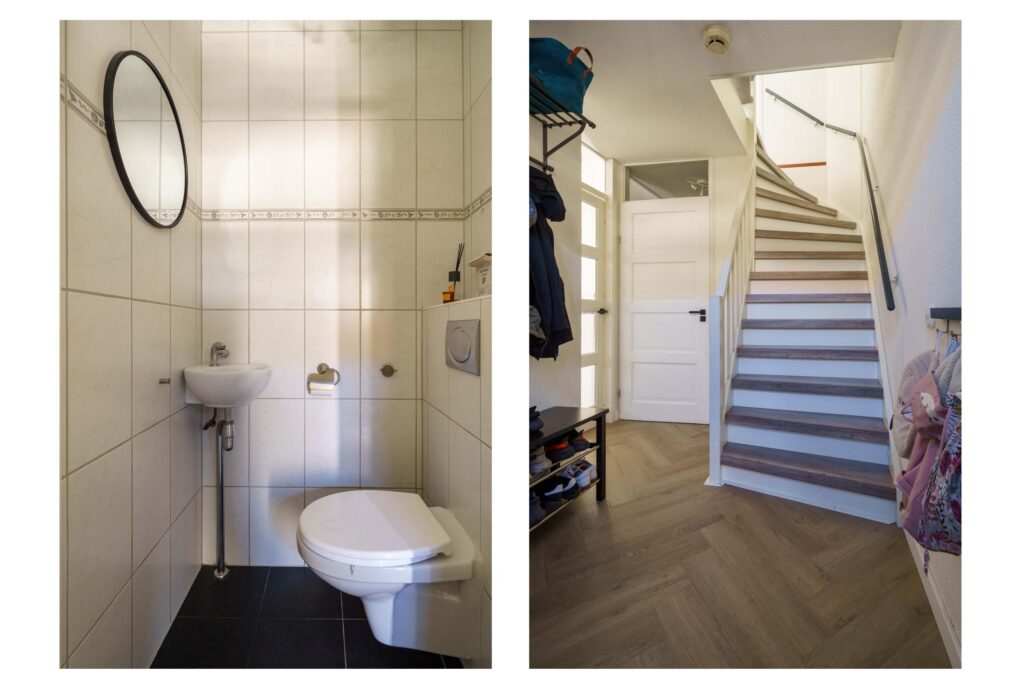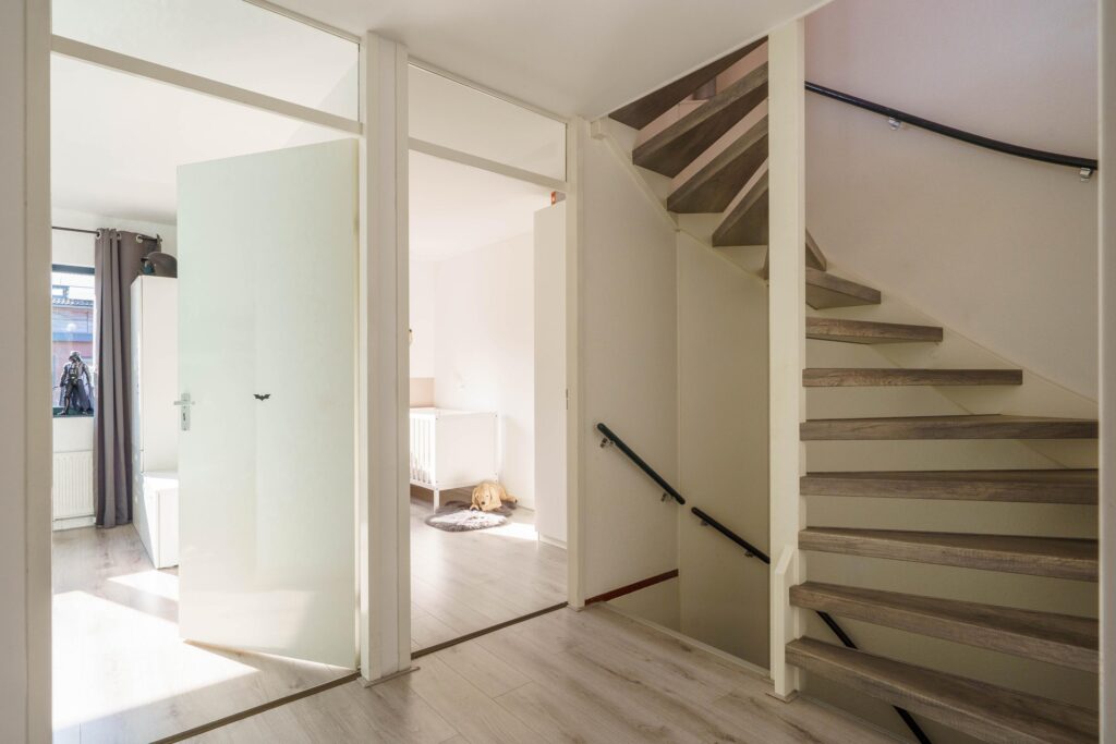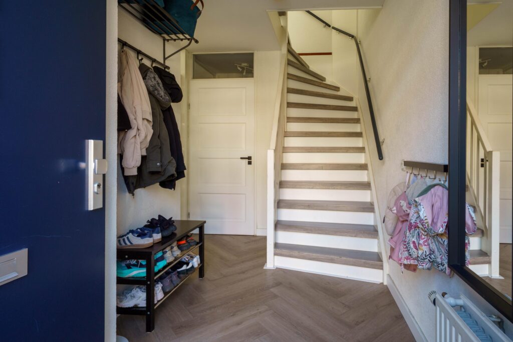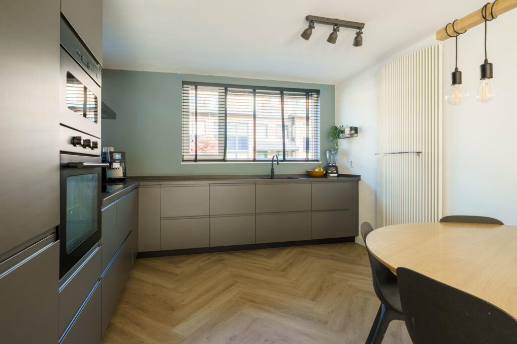 Entreehal met de meterkast, het toilet en toegang tot de ruime living. De woonkamer (met airco) bevindt zich aan de tuinzijde van de woning. Door de uitbouw heeft u hier veel ruimte en door de brede schuifpui heeft u een prachtig zicht op de achtertuin. De ruime keuken is aan de voorzijde gelegen en v.v. een moderne inbouwkeuken (geplaatst in 2023) in L-opstelling met alle wenselijke inbouwapparatuur wo. een koel-/vriescombinatie, vaatwasser, magnetron, oven, inductie kookplaat en een afzuigschouw (met motor en gevelafvoer). U heeft hier eveneens voldoende daglicht door de hoge ramen. De vloer op de begane grond is afgewerkt met pvc, de wanden zijn afgewerkt met sierpleister. Via de trap in de hal bereikt u de eerste verdieping.