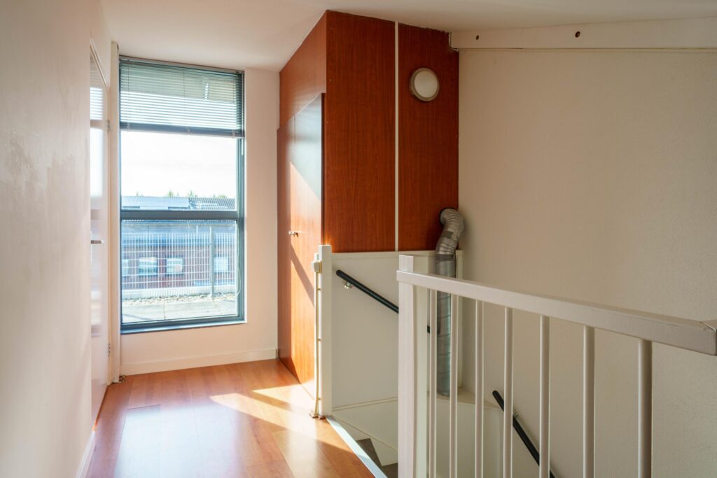 Overloop met wasmachinekast en toegang tot de 4e slaapkamer met dakterras van maar liefst 13 m2. Veel bergruimte in de woningbrede berging welke eveneens vanaf de overloop bereikbaar is. De vloer op deze verdieping is uitgevoerd met laminaat.