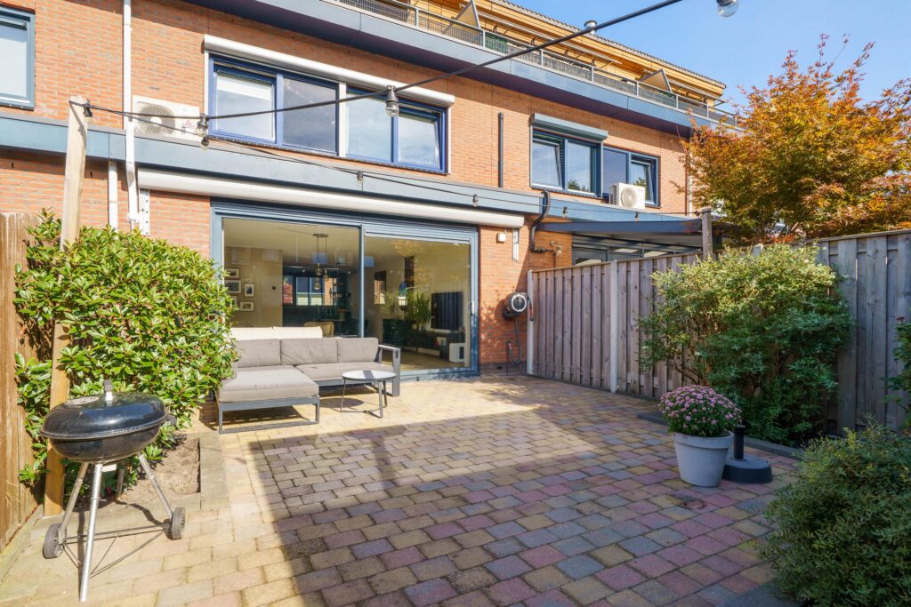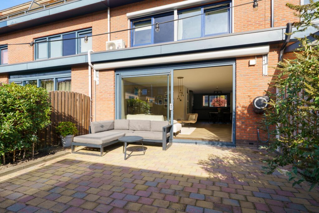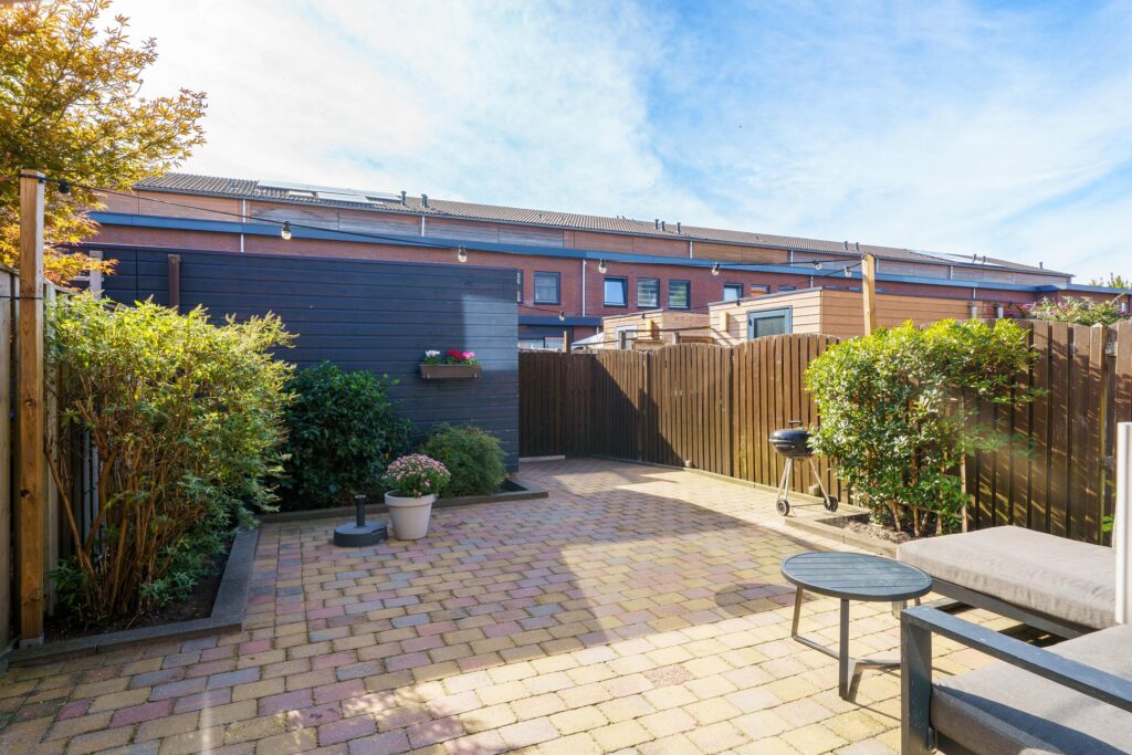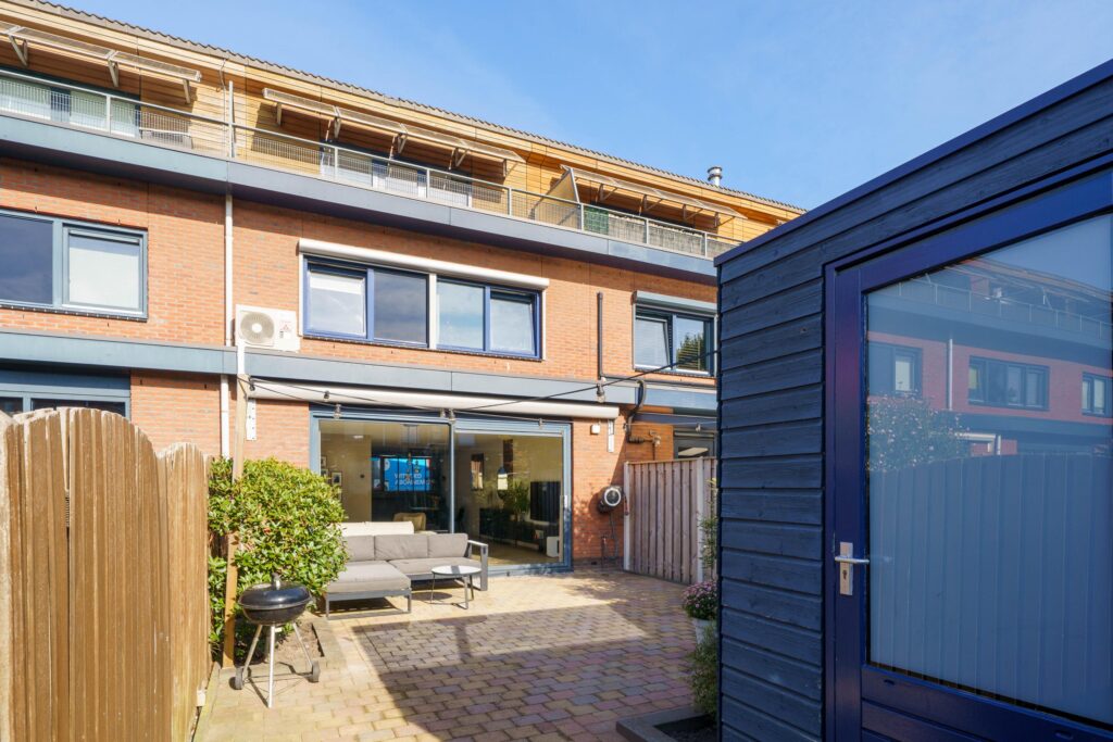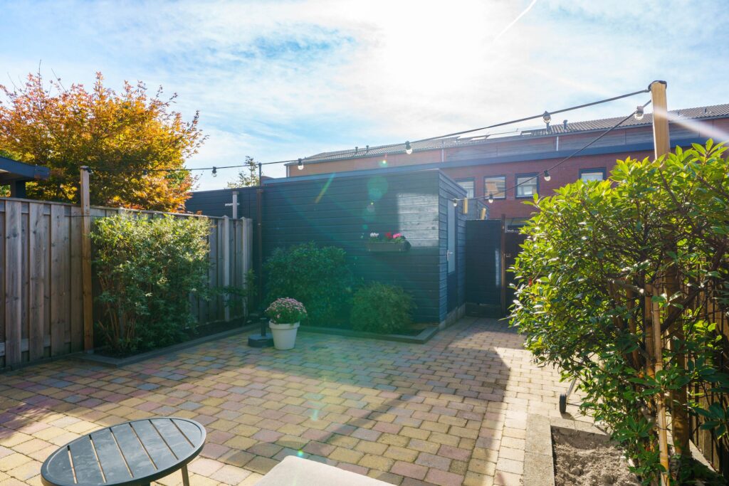 De achtertuin is eveneens aangelegd met sierbestrating, borders met groen en een ruime berging. De achtertuin is tevens via de achterom bereikbaar. Aan de achterzijde van de woning is een elektrisch zonnescherm en een buitenkraan aanwezig.