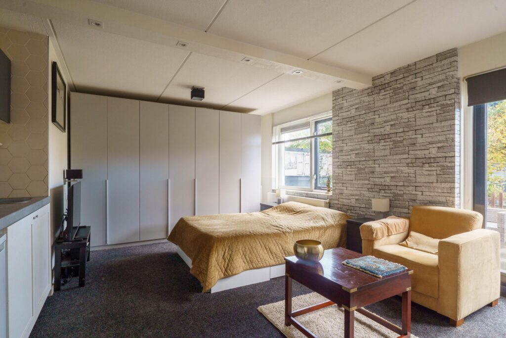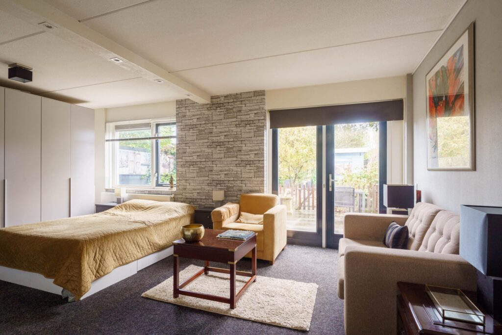 Achter de tussendeur ligt een ruime, lichte hal met groot raampartij en toegang tot de tuin-/werkkamer, voorzien van een extra keukenblok. Deze ruimte is tevens geschikt als derde slaapkamer of ideaal als praktijkruimte, kantoor of salon aan huis. Via de openslaande deuren bereikt u de fraai aangelegde achtertuin op het noordwesten.