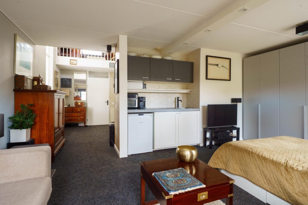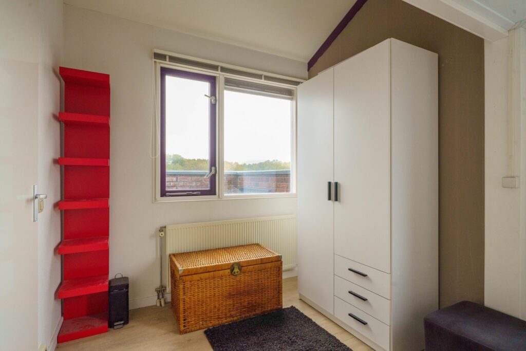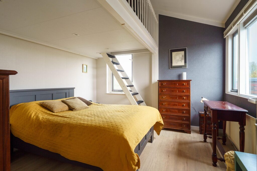 Op de bovenverdieping bevinden zich twee slaapkamers, de badkamer, en toegang tot het ruime dakterras op het oosten. De badkamer is compleet ingericht met douchecabine, toilet en wastafelmeubel. Door de hoge plafonds in de slaapkamers zijn deze beide uitgevoerd met een entresol voor bijvoorbeeld een bed (of werkruimte). Dit vinden kinderen fantastisch! De slaapkamers en overloop zijn afgewerkt met een laminaatvloer.