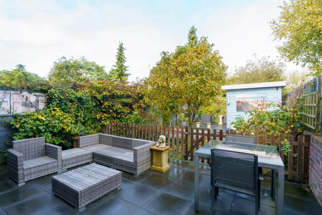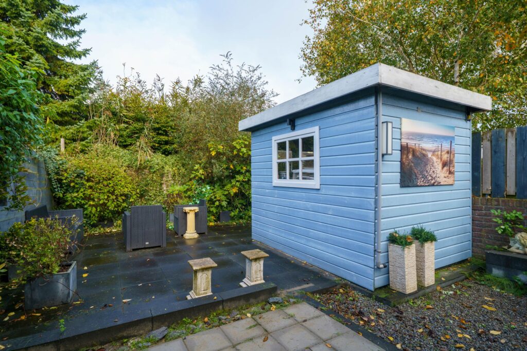 De achtertuin is maar liefst 15,5 meter lang en smaakvol aangelegd met meerdere terrassen, borders en een houten berging. Een groot voordeel van de hoekligging is dat de achtertuin eveneens via een zij ingang toegankelijk is. De voortuin is volledig bestraat en biedt parkeerruimte op eigen terrein. Via dubbele deuren is de garage direct toegankelijk.