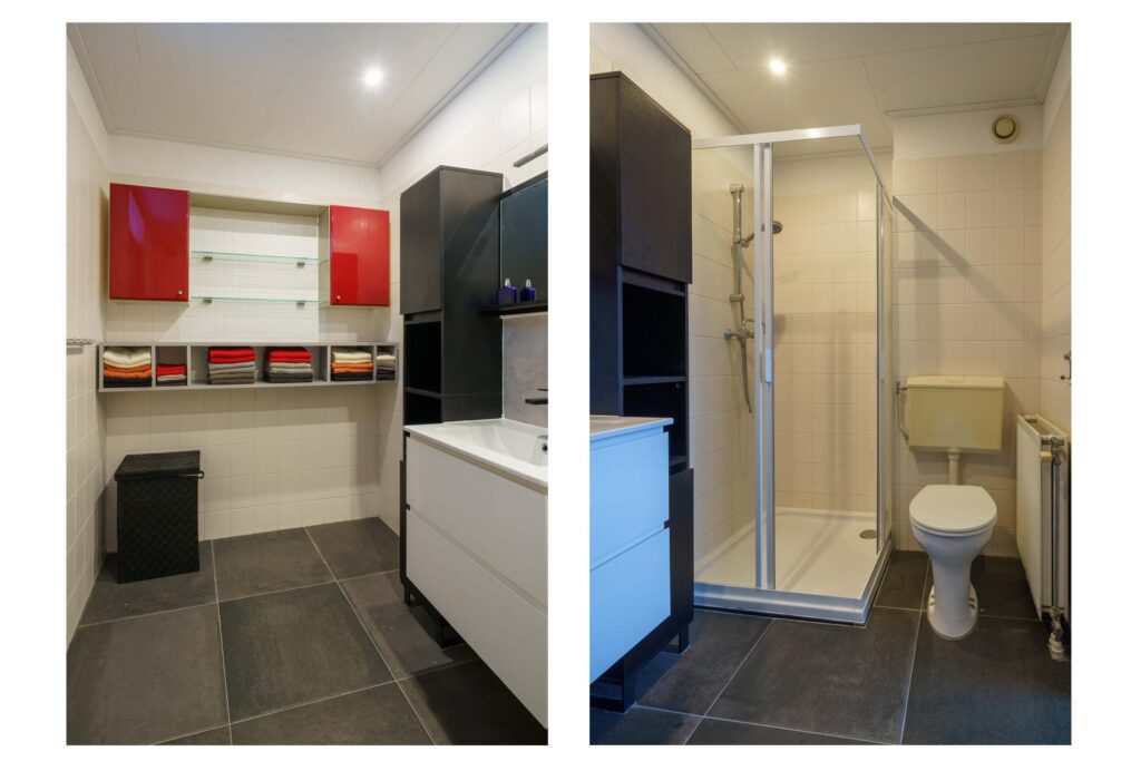 • Badkamer met douche, toilet, wastafelmeubel en verlaagd plafond met spots