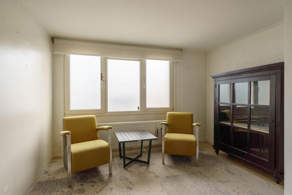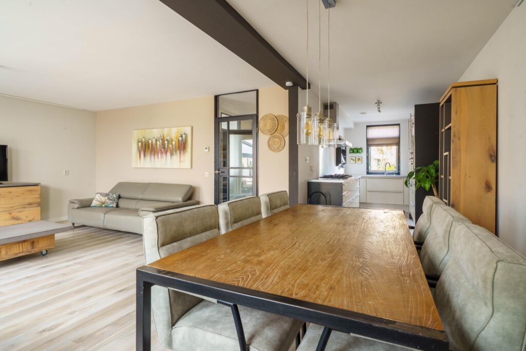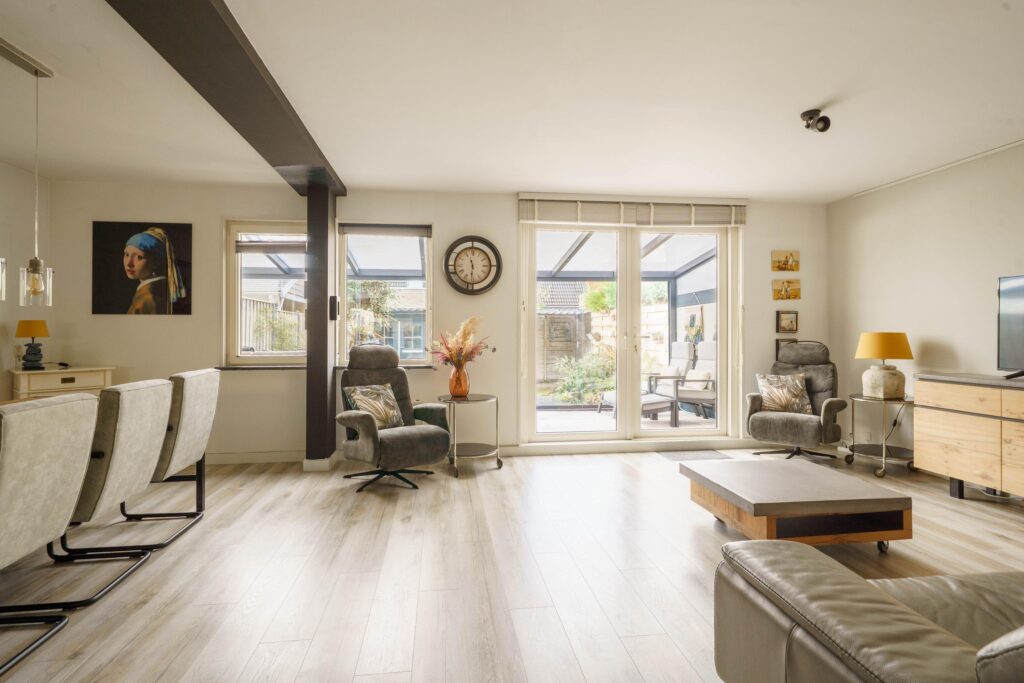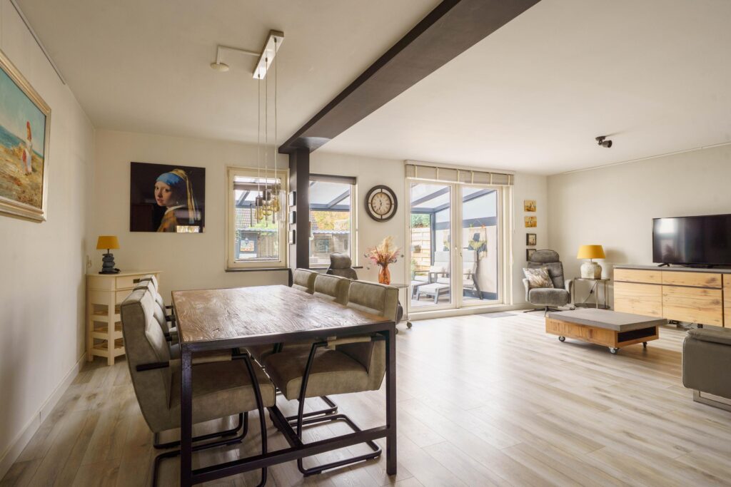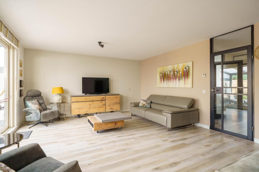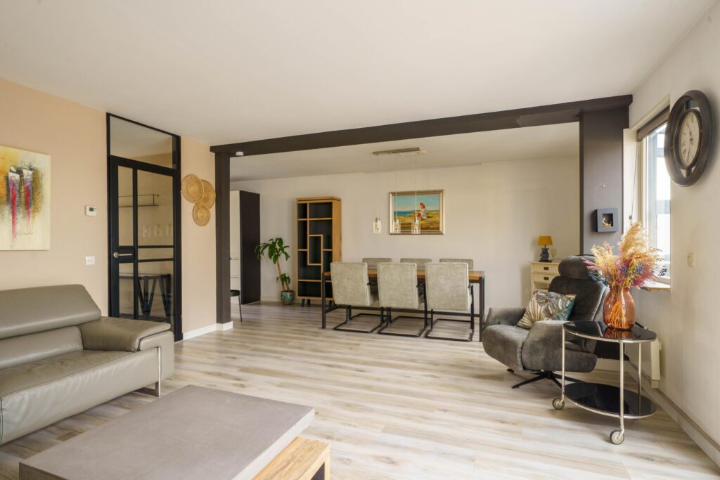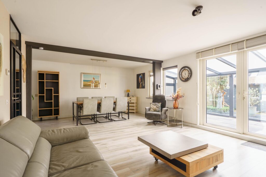 De royale living van ruim 7 meter breed (en maar liefst 34 m2) is tuingericht en biedt via de afsluitbare veranda van 21 m² toegang tot de achtertuin. Wanden en plafond zijn glad gestuukt, wat een moderne en strakke uitstraling geeft.