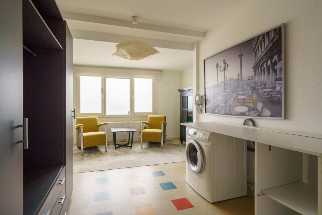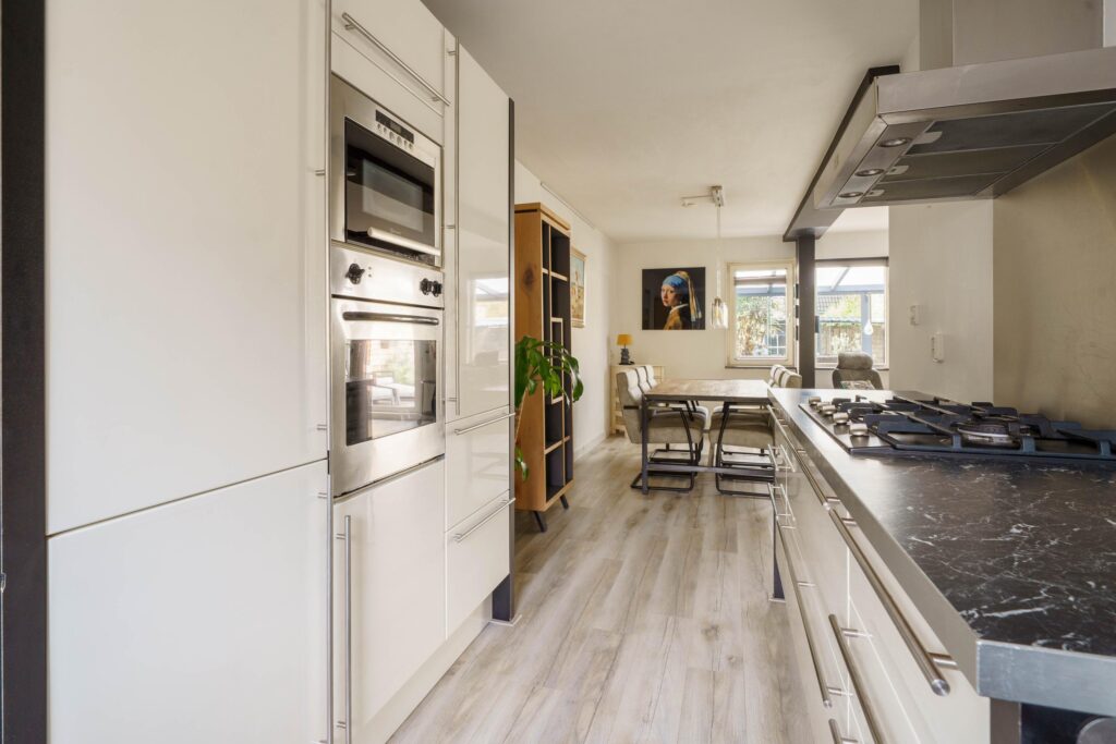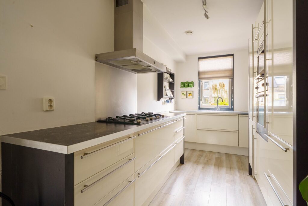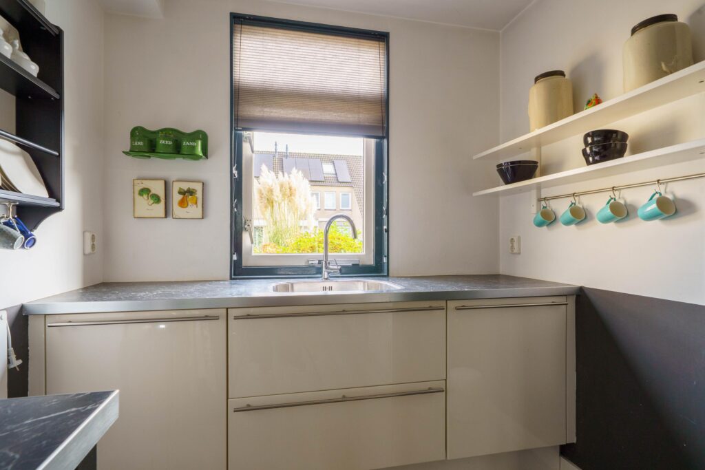De moderne inbouwkeuken, bestaande uit 2 rechte blokken en een kastenwand, is volledig uitgerust met alle gewenste apparatuur en ligt aan de straatzijde met groot raam.
