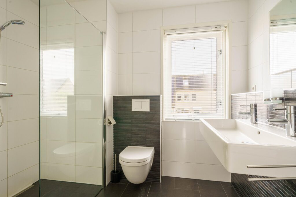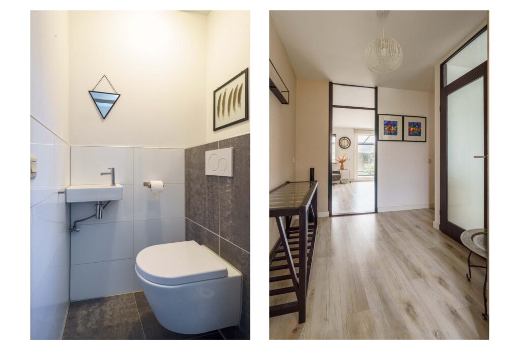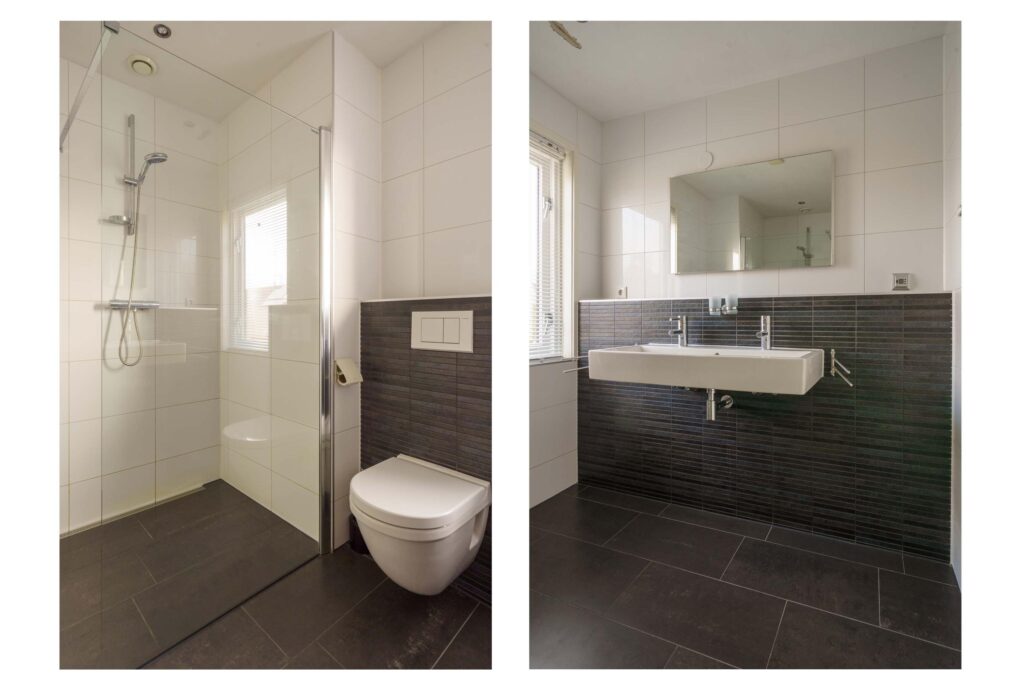 • Luxe, volledig betegelde badkamer met inloopdouche, 2e toilet, dubbele wastafel, vloerverwarming en raam aan de voorzijde