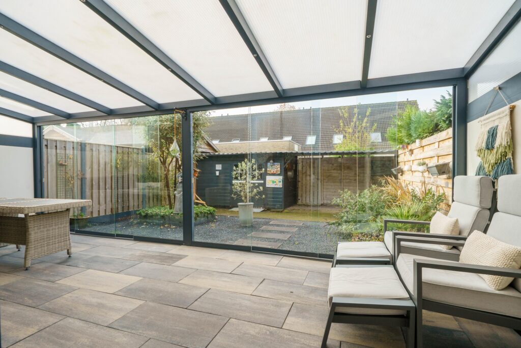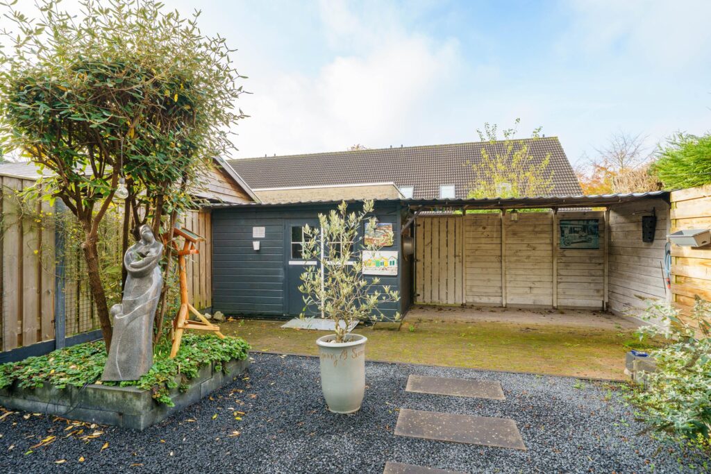 De achtertuin ligt op het zuidwesten en is onderhoudsvriendelijk ingericht met sierbestrating, berg van 7 m² met overkapping, twee verhoogde borders met groen en een achterom. De afsluitbare veranda van 21 m² met glazen schuifdeuren en geïntegreerde verlichting biedt een fijne buitenruimte het hele jaar door.