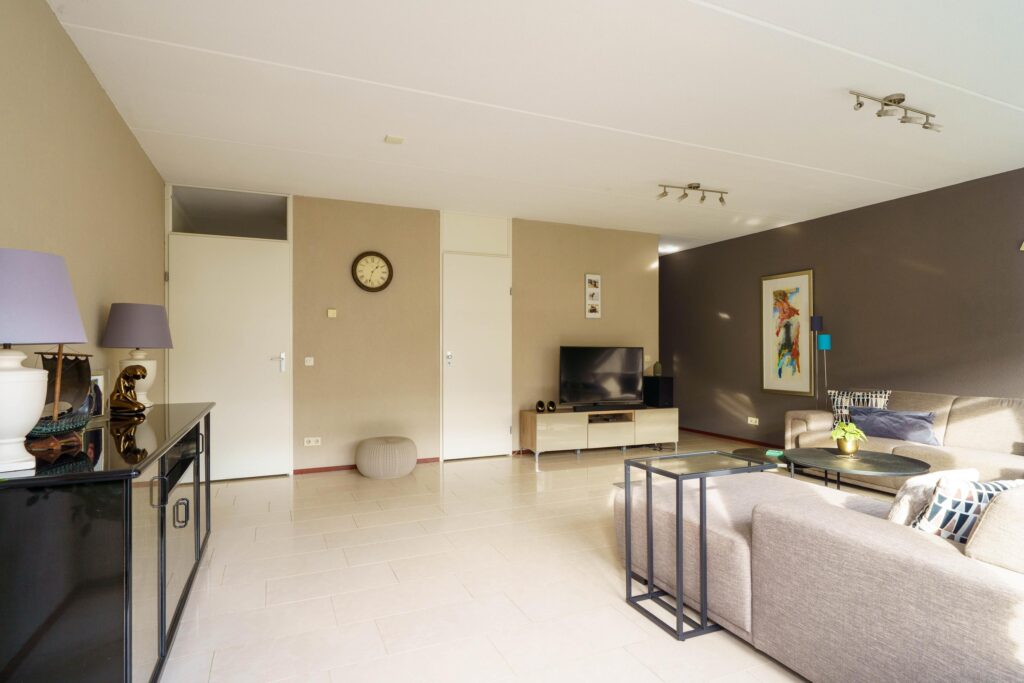 De tuingerichte woonkamer is gelegen over de volledige breedte van de woning (ca. 6,25 meter) en heeft grote raampartijen, waardoor er veel licht binnenvalt en er een mooi zicht is op de achtertuin. De vloer op de begane grond is afgewerkt met plavuizen met vloerverwarming en de wanden met spachtelputz.
