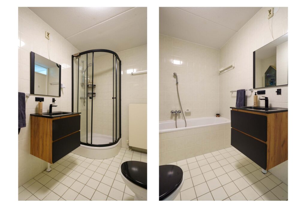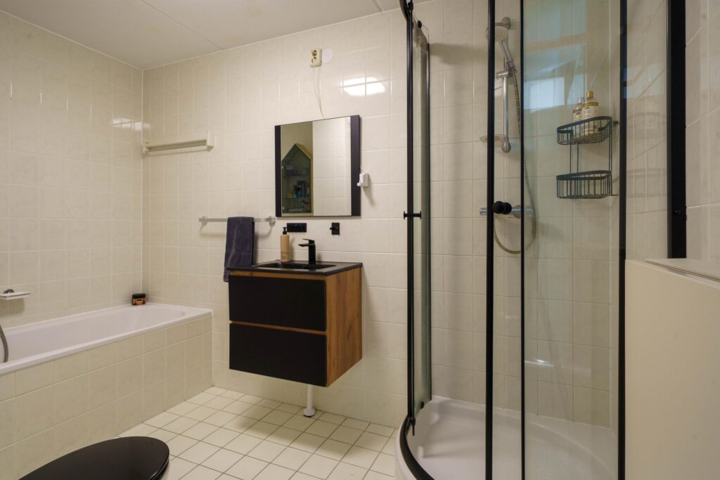 De badkamer is volledig betegeld tot aan het plafond en uitgerust met een ligbad, douchecabine, toilet en wastafelmeubel, waardoor comfort en functionaliteit perfect samenkomen.