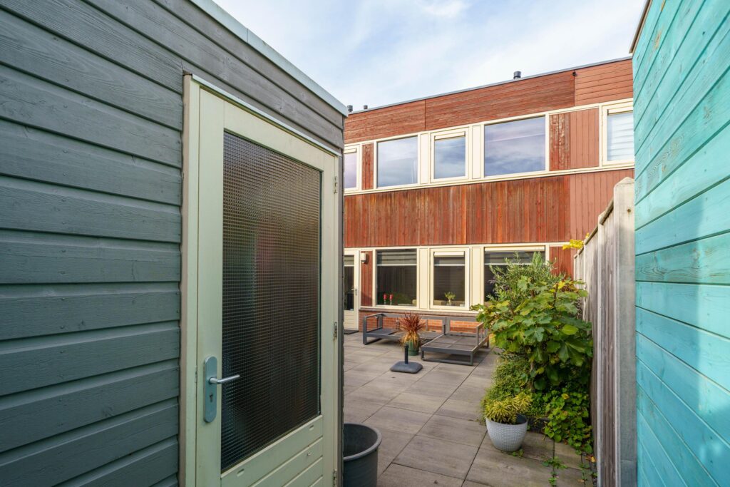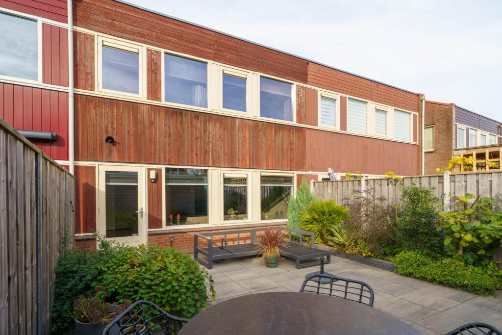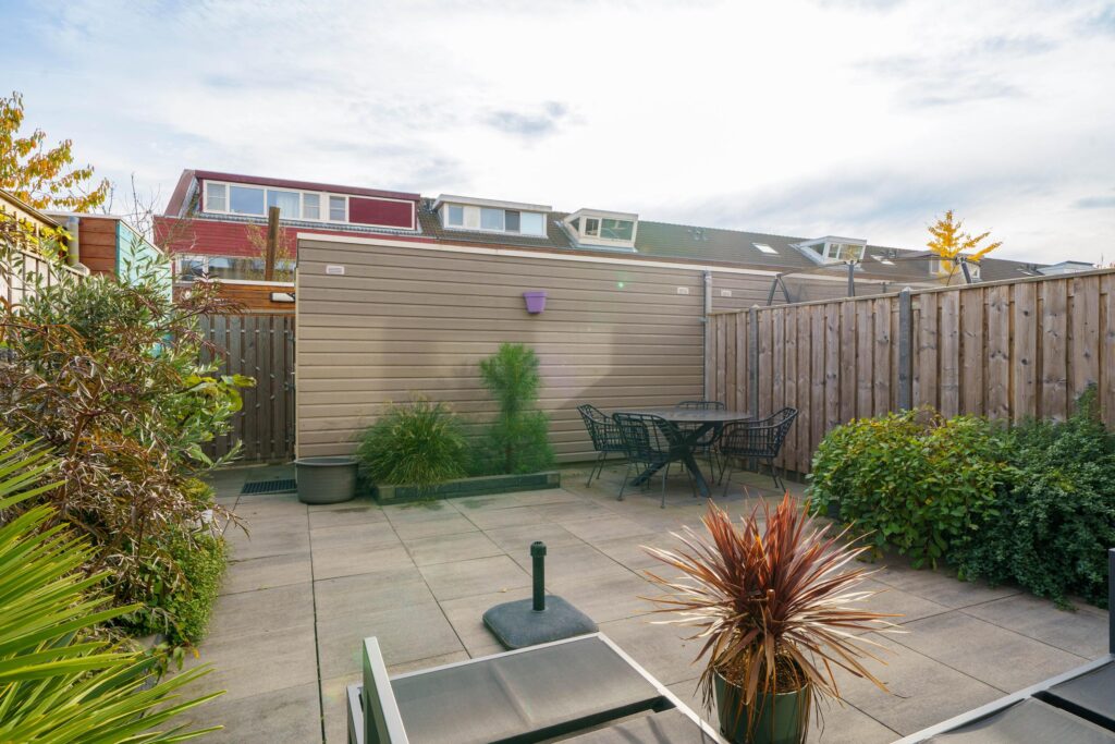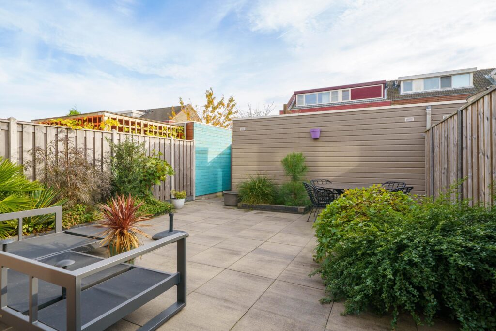De brede achtertuin is gesitueerd op het zuidoosten en is onderhoudsvriendelijk aangelegd met bestrating en een ruime berging van circa 12 m². De tuin beschikt over een buitenkraan en een achterom.