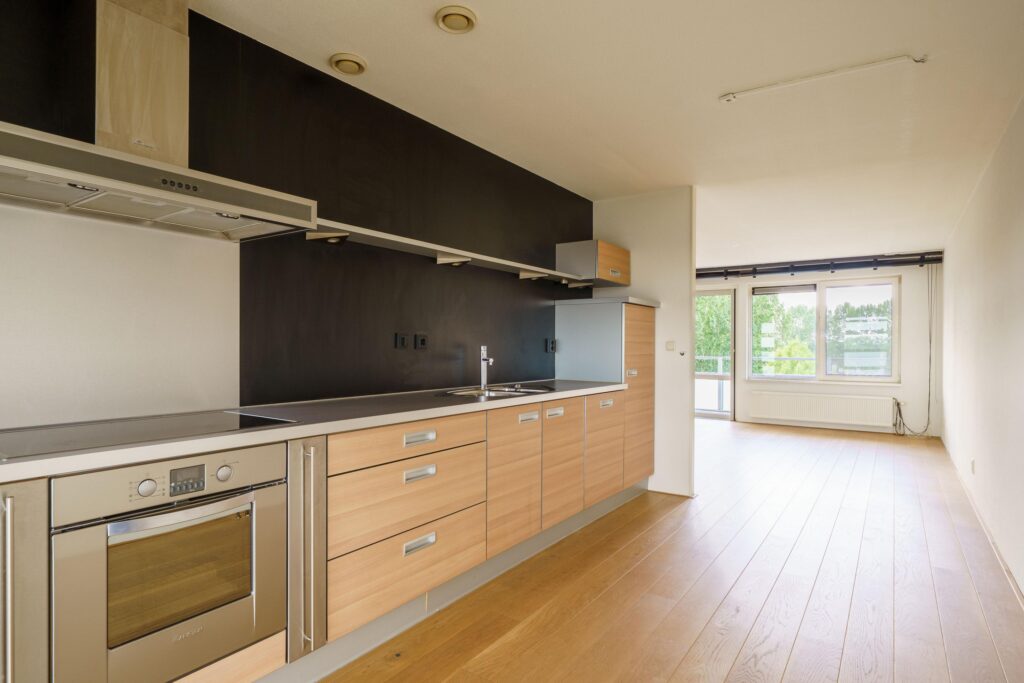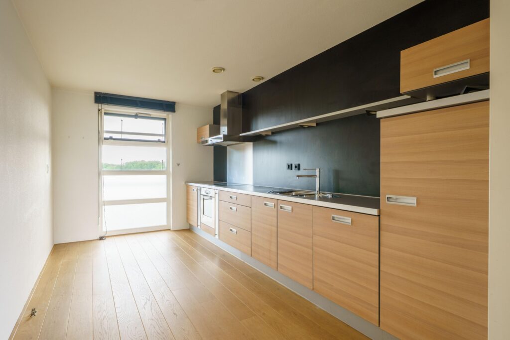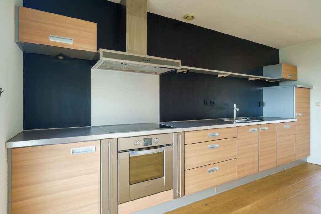 De open keuken is aan de voorzijde gesitueerd en is voorzien van diverse (Neff) apparatuur w.o. een oven, koelkast, vaatwasser keramische kookplaat en een afzuigschouw (recirculatie)