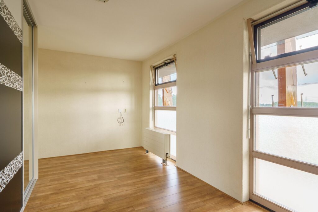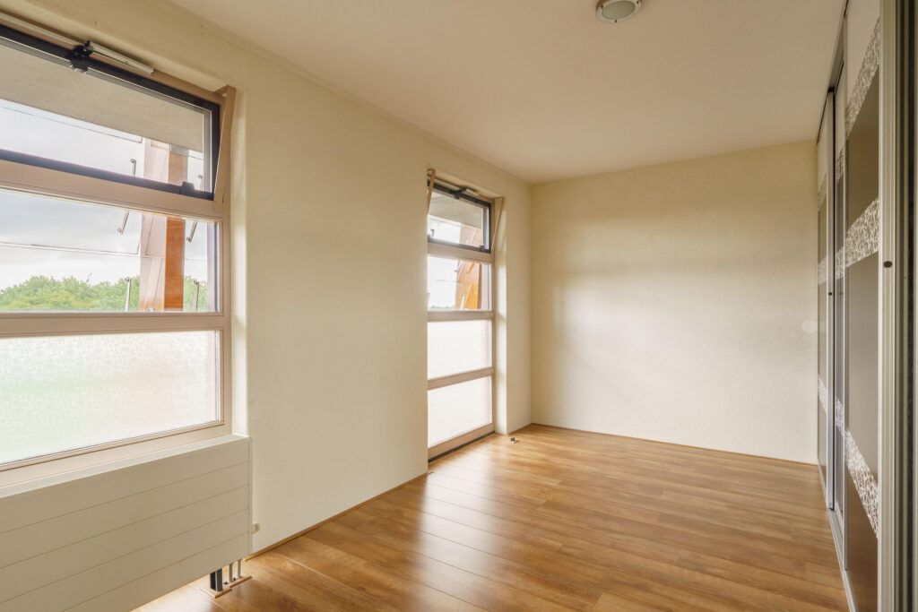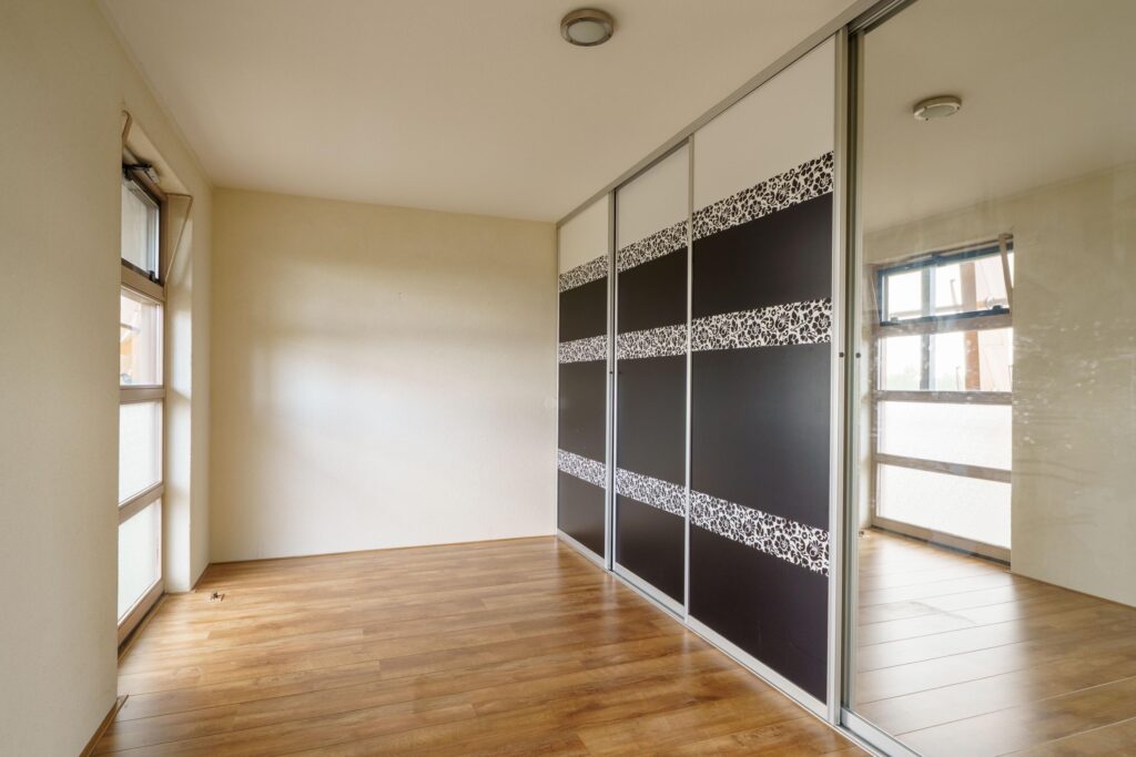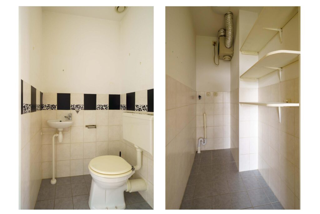 Entreehal met meterkast, toilet (met fonteintje), technische ruimte met naast de wasmachineaansluiting en mechanische ventilatie-unit ook nog extra bergruimte en de 2 ruime slaapkamers (ca. 17 en 15 m2) welke beide zijn v.v. een vaste kastenwand met schuifdeuren. Er kan eventueel een 3e slaapkamer worden gerealiseerd door de slaapkamer aan de achterzijde op te splitsen in 2 slaapkamers.