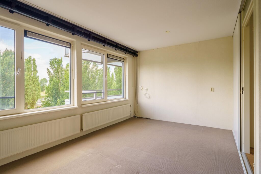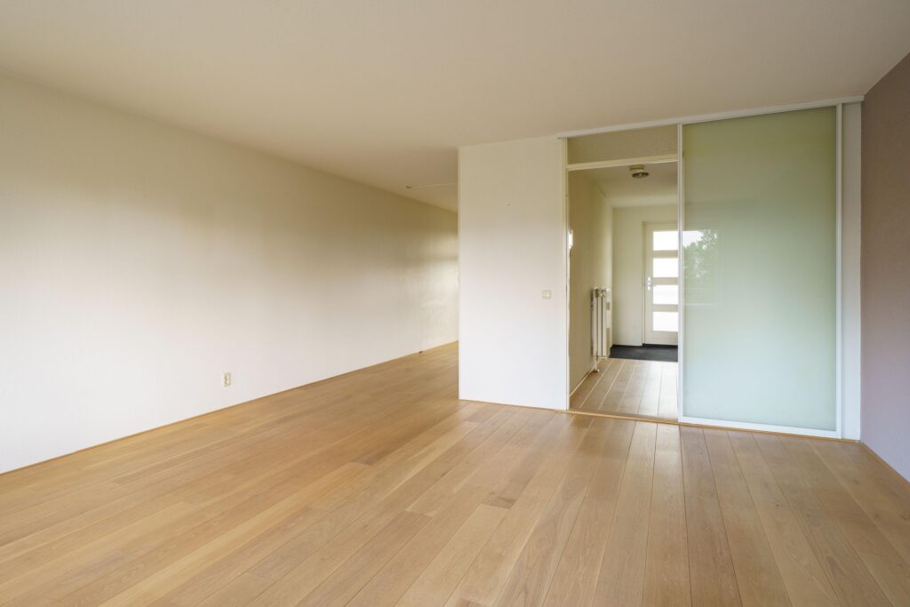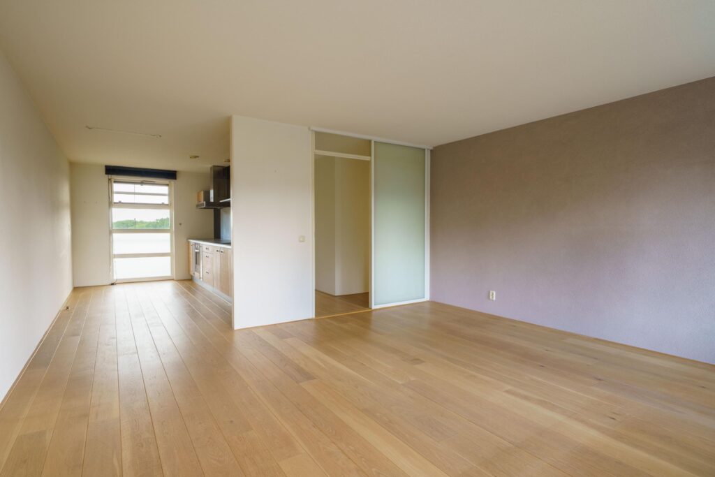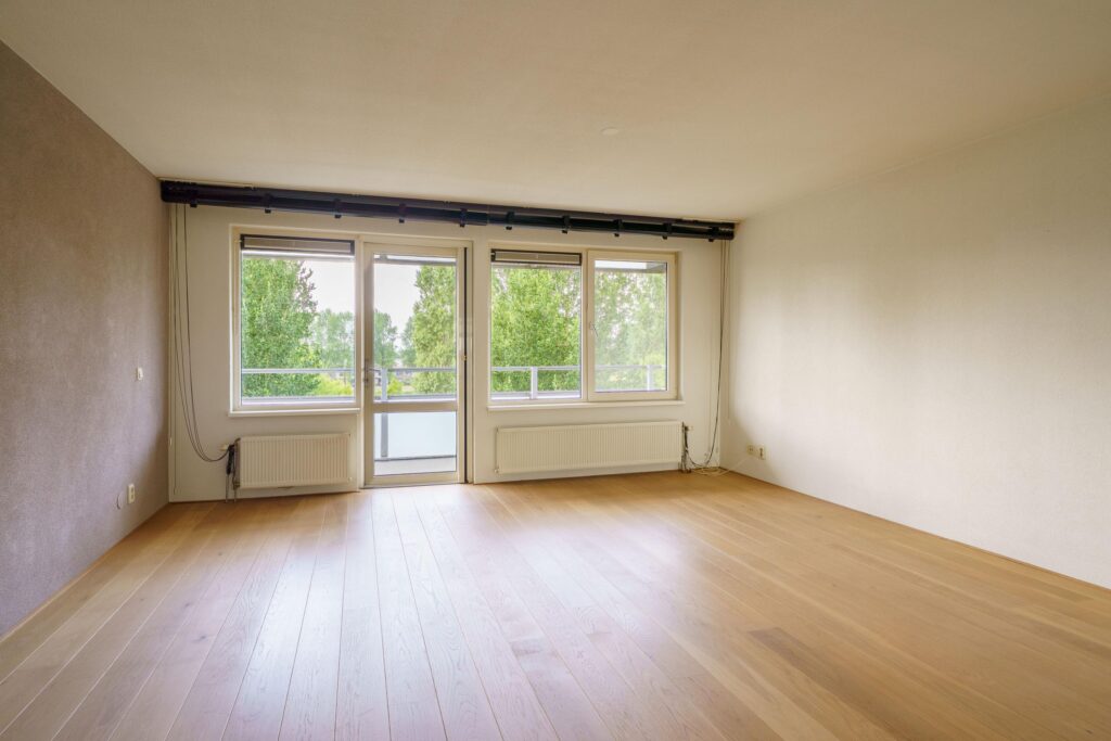 Ruime, lichte woonkamer met toegang tot het grote balkon welke een fantastisch uitzicht over de “Hoge Vaart” biedt. Het balkon is gelegen op het zuidwesten waardoor het fijn is dat er reeds een elektrisch zonnescherm aanwezig is.