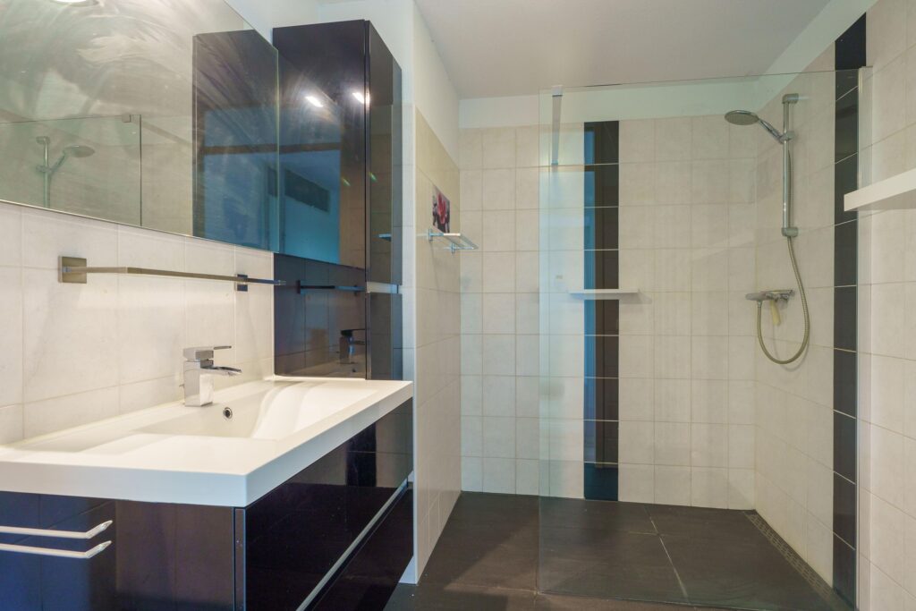 Badkamer: De badkamer in lichte kleurstelling is voorzien van een ruime inloopdouche, wastafelmeubel en verwarming.