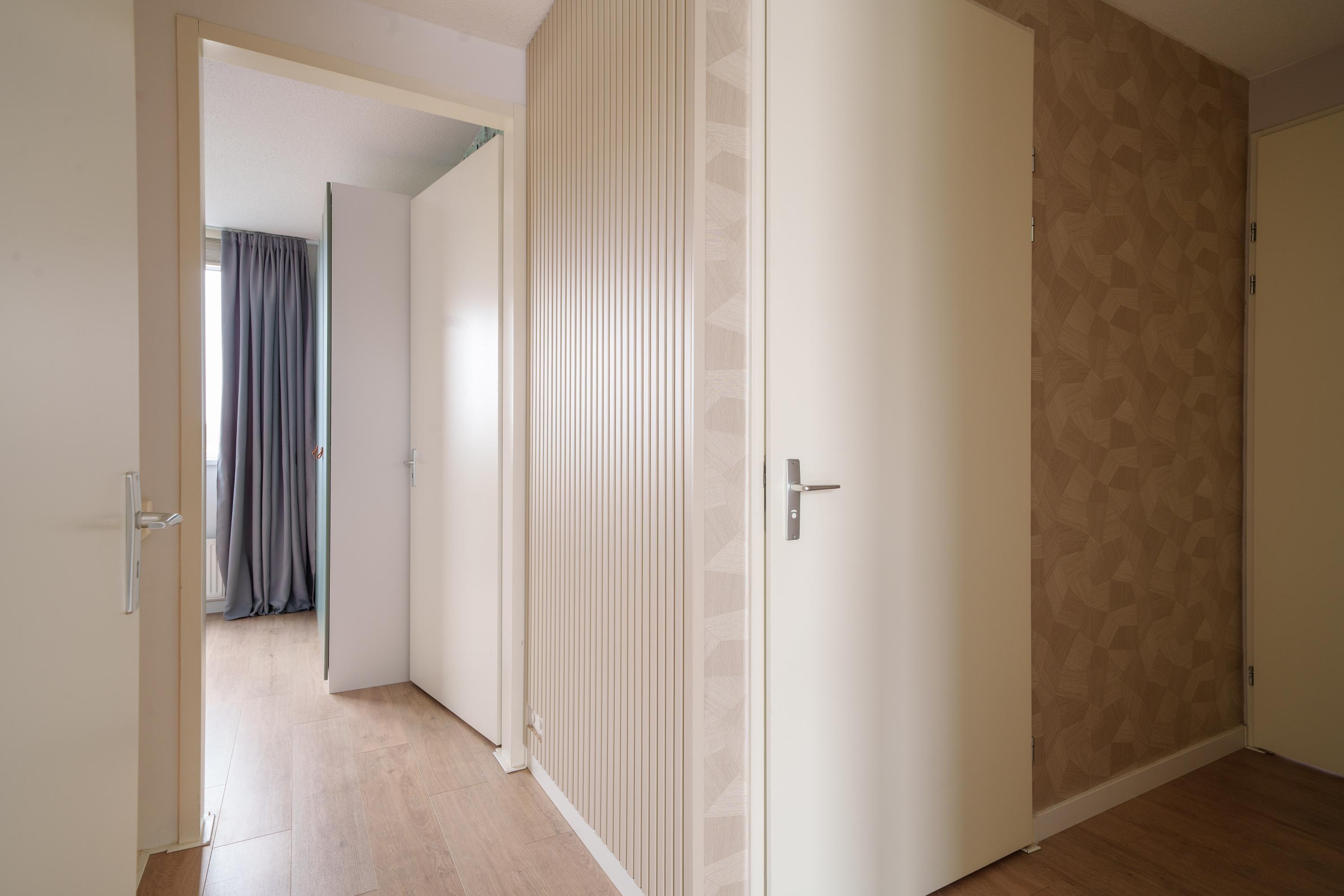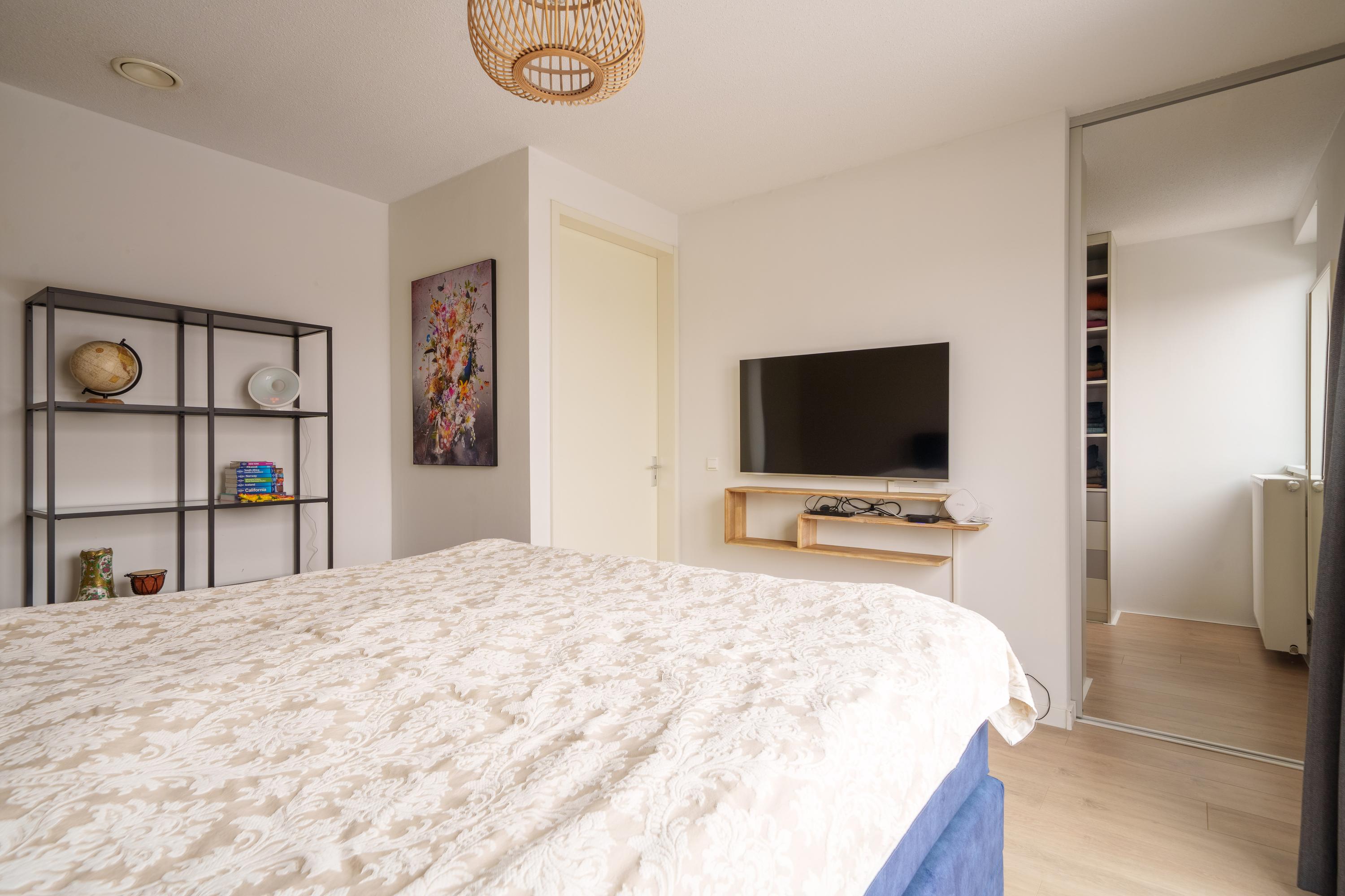 Overloop met 3 slaapkamers, waarvan de masterbedroom beschikt over een inloopkast en directe toegang tot het dakterras van 17 m². De badkamer is volledig betegeld, voorzien van ligbad, inloopdouche, 2e toilet, wastafelmeubel met dubbele wastafel en brede spiegel met verwarming. Groot raam aan de voorzijde voor daglicht.