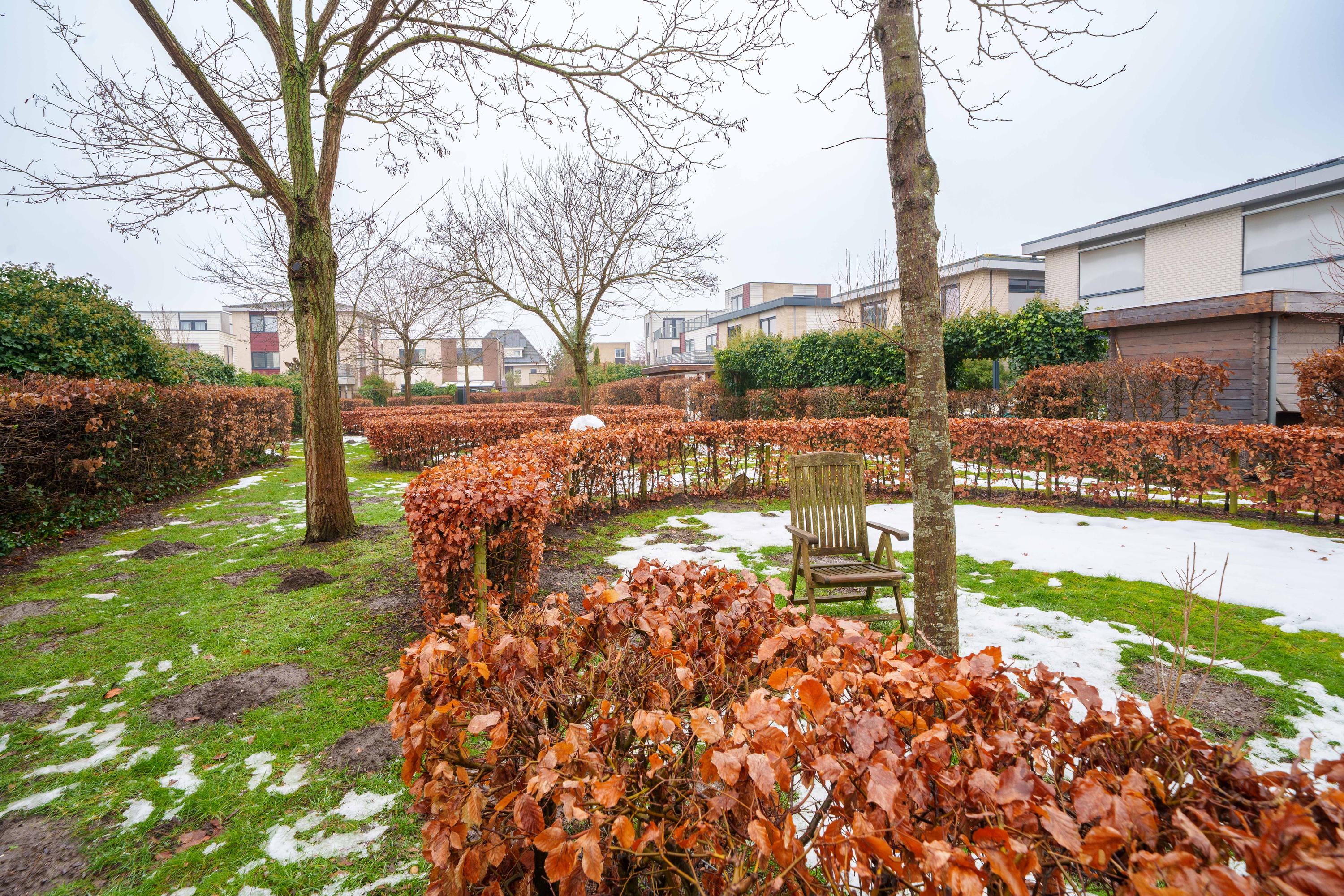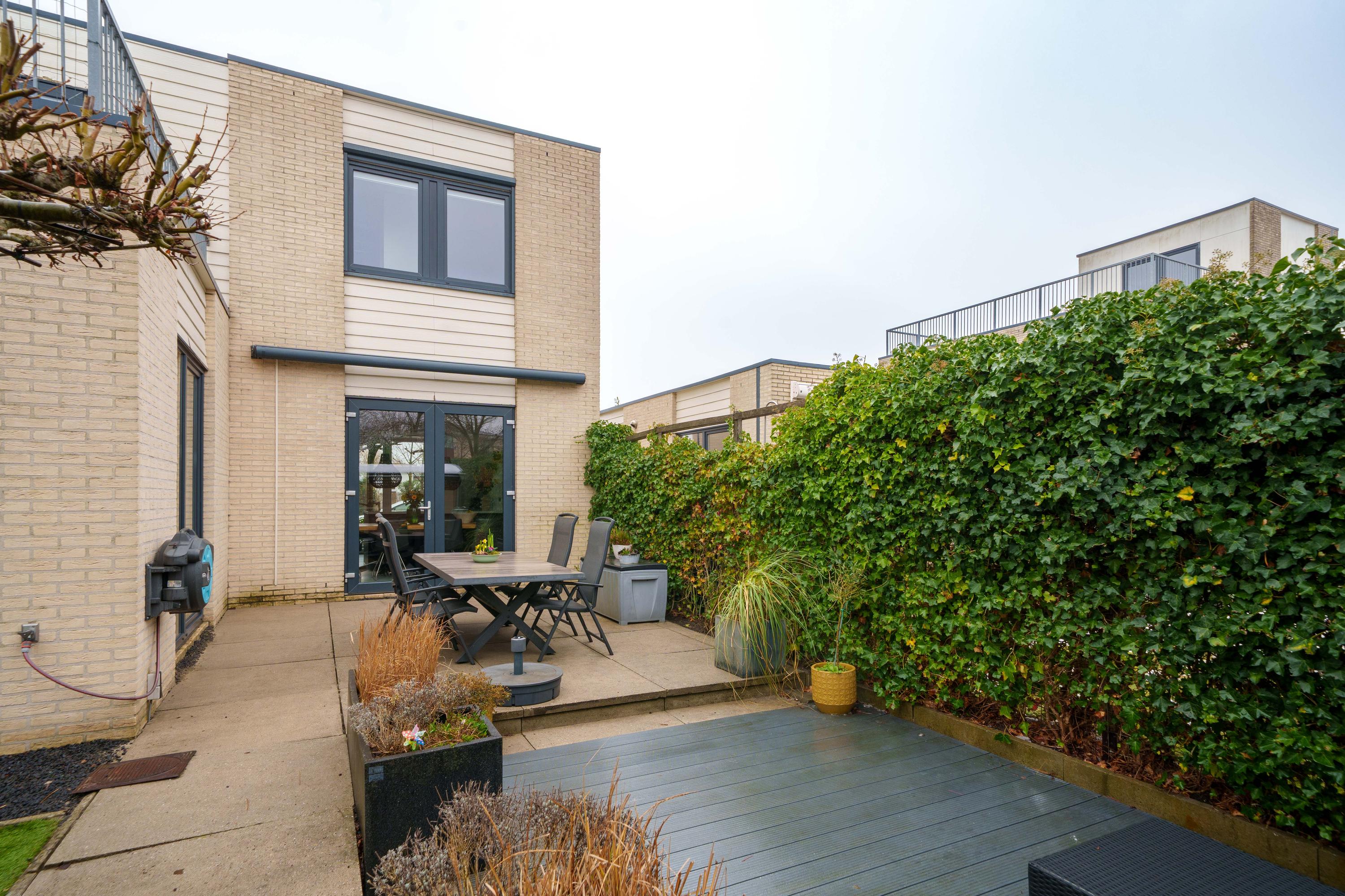 Royale, keurig aangelegde achtertuin op het zuidwesten met meerdere terrassen, extra berging en achterom met toegang tot de gemeenschappelijke tuin. Aan de achterzijde zijn een zonnescherm en twee screens aanwezig.