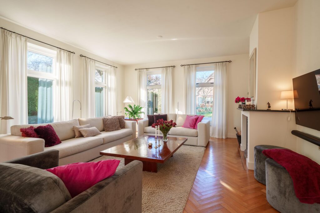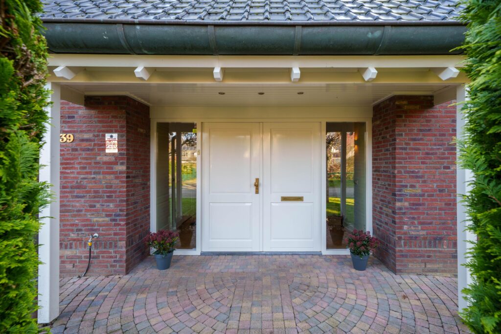 Via de dubbele voordeur kom je in de royale entreehal van de woning. Deze hal voelt verrassend ruim aan en biedt via drie dubbele deuren toegang tot de verschillende leefruimtes.