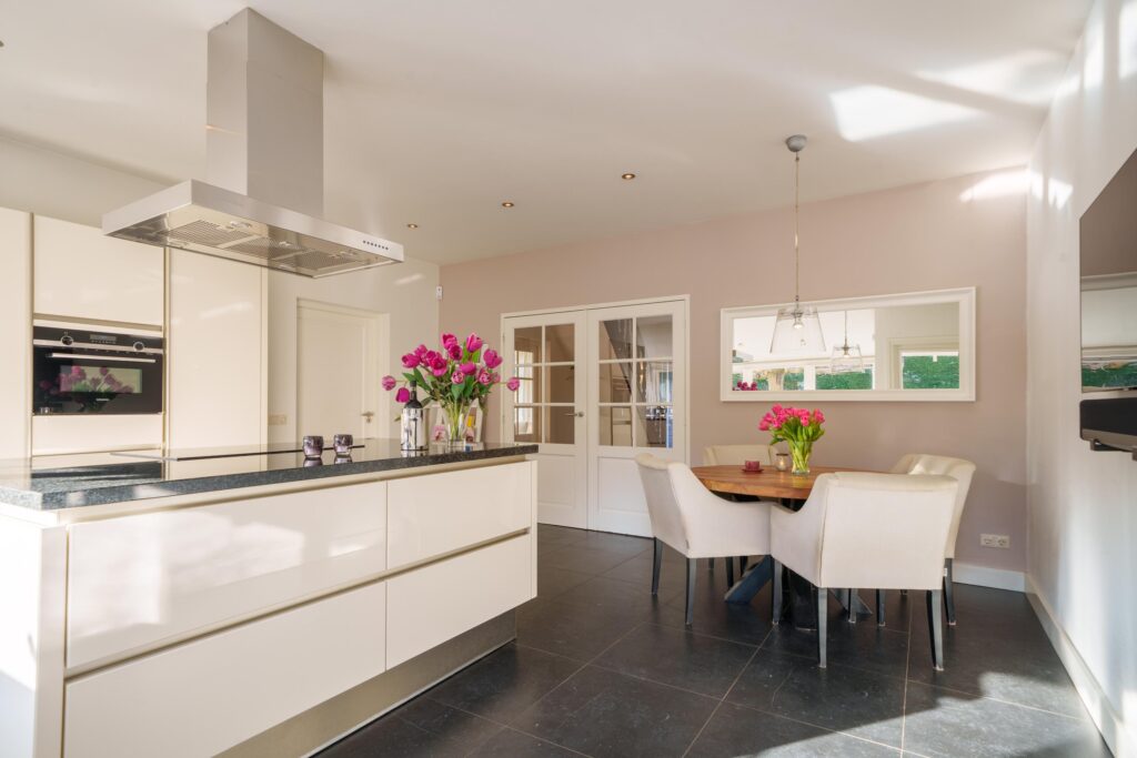 De luxe Siematic leefkeuken vormt het hart van het huis en is uitgevoerd met een kookeiland en granieten werkbladen. De keuken beschikt over alle wenselijke inbouwapparatuur, waaronder een inductiekookplaat, afzuigkap, vaatwasser, koelkast, combimagnetron en close-in boiler. Er is hier voldoende ruimte voor een eethoek en vanuit de keuken is er direct toegang tot de achtertuin. Op de begane grond bevindt zich tevens een toiletruimte.