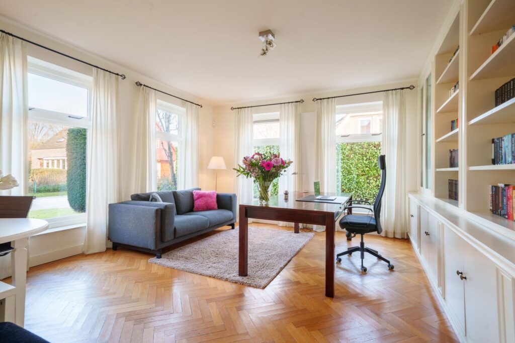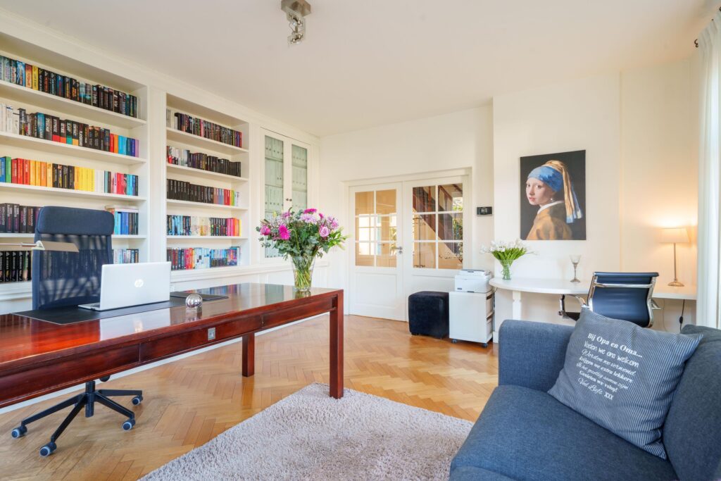 Aan de voorzijde van het huis bevindt zich, direct naast de entreehal, een ruime werkkamer, ideaal voor thuiswerken of bijvoorbeeld een bibliotheek. De riante woonkamer is licht en voorzien van een sfeervolle haard en dubbele openslaande deuren naar de achtertuin. Aan de achterzijde van de woning is een tweede werkkamer gesitueerd, eveneens perfect als kantoor-, hobby- of praktijkruimte. Vanuit deze kamer heb je via openslaande deuren eveneens toegang tot de achtertuin.