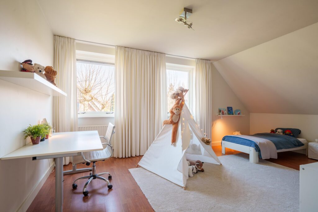 De andere twee slaapkamers zijn eveneens royaal, met voldoende ruimte voor een tweepersoonsbed en kasten. De grote ramen zorgen voor veel licht.