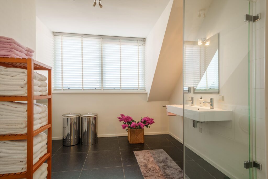 De tweede badkamer is voorzien van een douchehoek, dubbele wastafel en de aansluitingen voor wasmachine en droger. Op de overloop bevindt zich daarnaast een aparte toiletruimte.