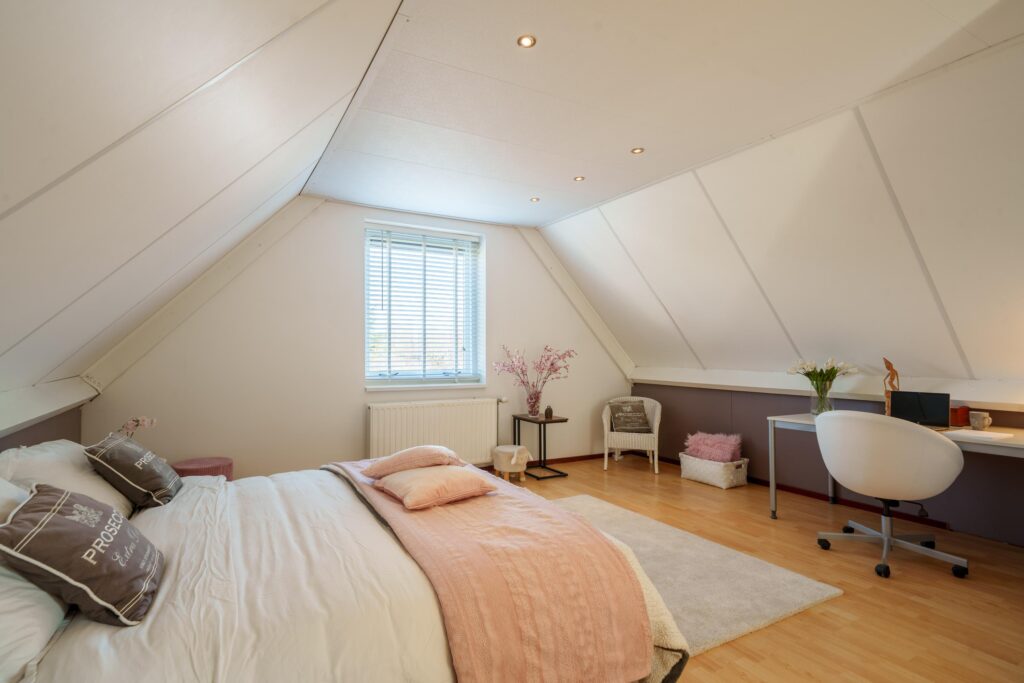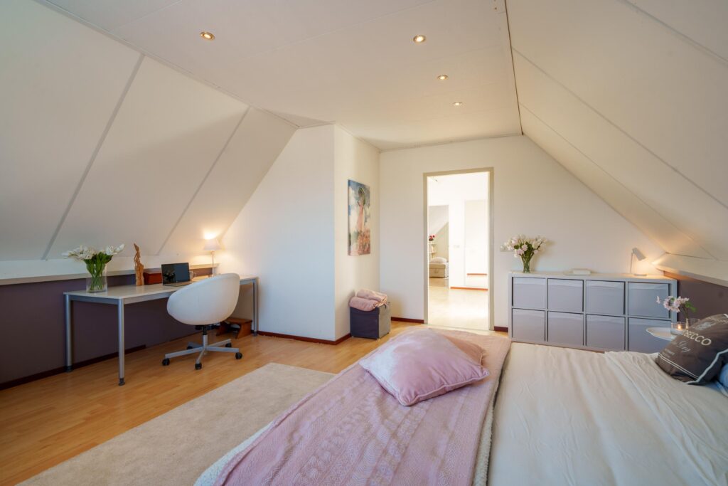 Ook hier tref je een royale overloop met vaste kastenwand en de opstelling van de cv-ketel. Daarnaast zijn er twee ruime kamers, ideaal als slaap-, werk- of logeerkamer te gebruiken.
