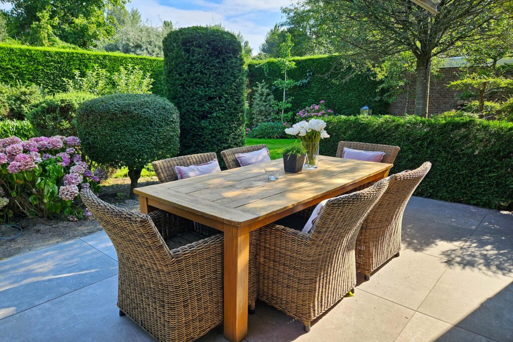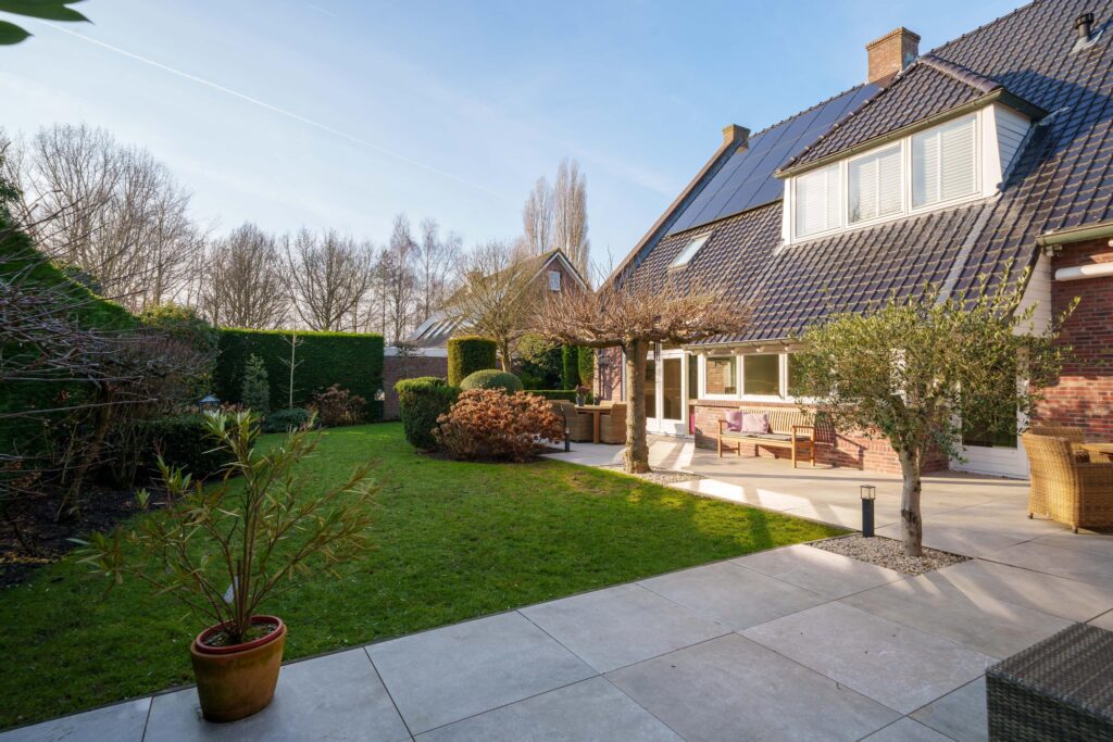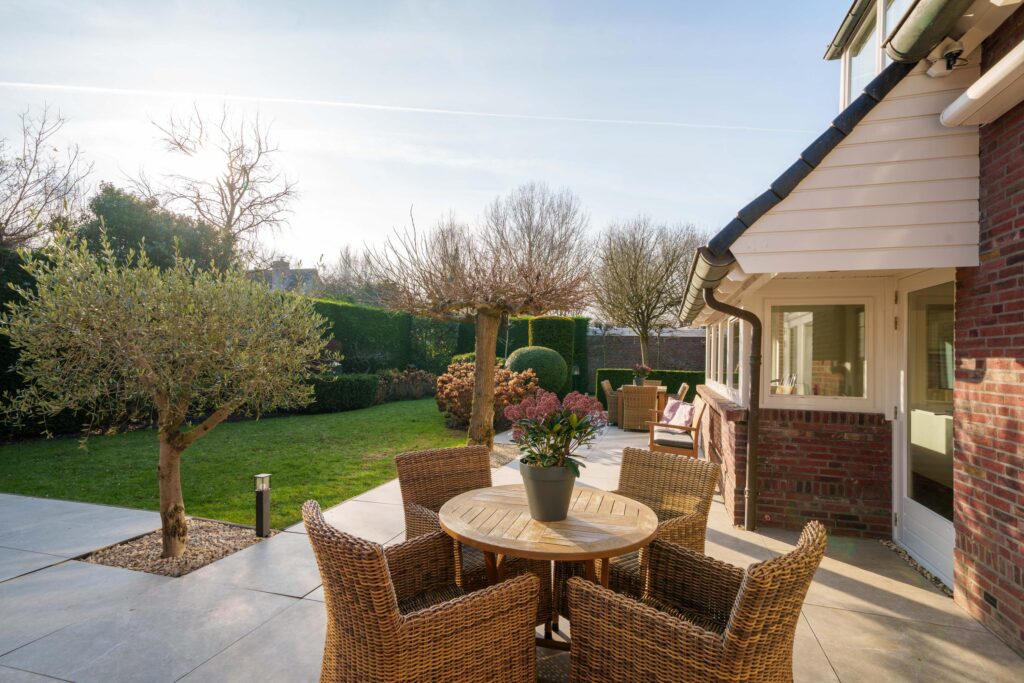 De tuin is rondom de woning gelegen en fraai aangelegd met veel groen, volwassen beplanting, tuinverlichting, beregeningssysteem en meerdere terrassen. Het hoofdterras is in 2023 vernieuwd en ligt gunstig ten opzichte van de zon. Zonneschermen zorgen voor extra comfort tijdens warme dagen. Een heerlijke buitenruimte met optimale privacy en vrijwel de hele dag zon.