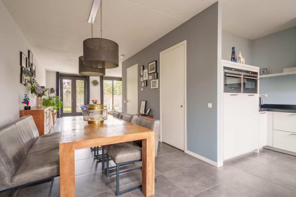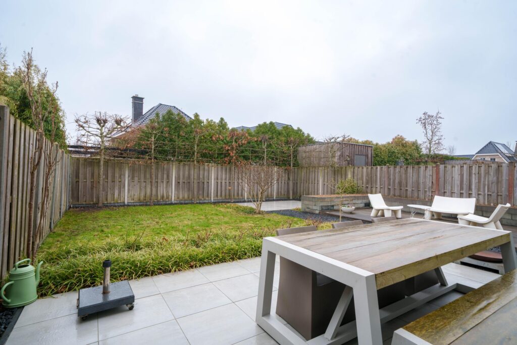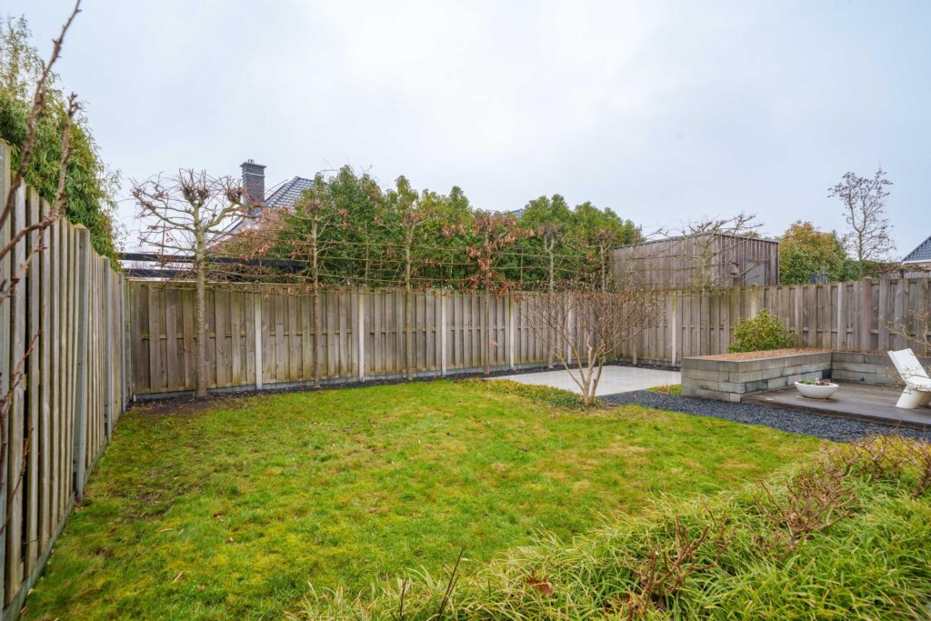 De achtertuin van ca. 150 m² is gelegen op het noordwesten, waardoor u optimaal kunt genieten van de late middag- en avondzon. De tuin is gelegen rondom de woning en modern aangelegd met sierbestrating, gazon en drie terrassen, waaronder één met houten vloerdelen. Veel privacy aan de achterzijde door de hoge leibomen. De achtertuin is bereikbaar via de dubbele deuren in de woonkamer of door de zijtuin. Aan de zijgevel van de woning bevindt zich een aangebouwde berging van ca. 8 m² met toegang vanaf de oprit.