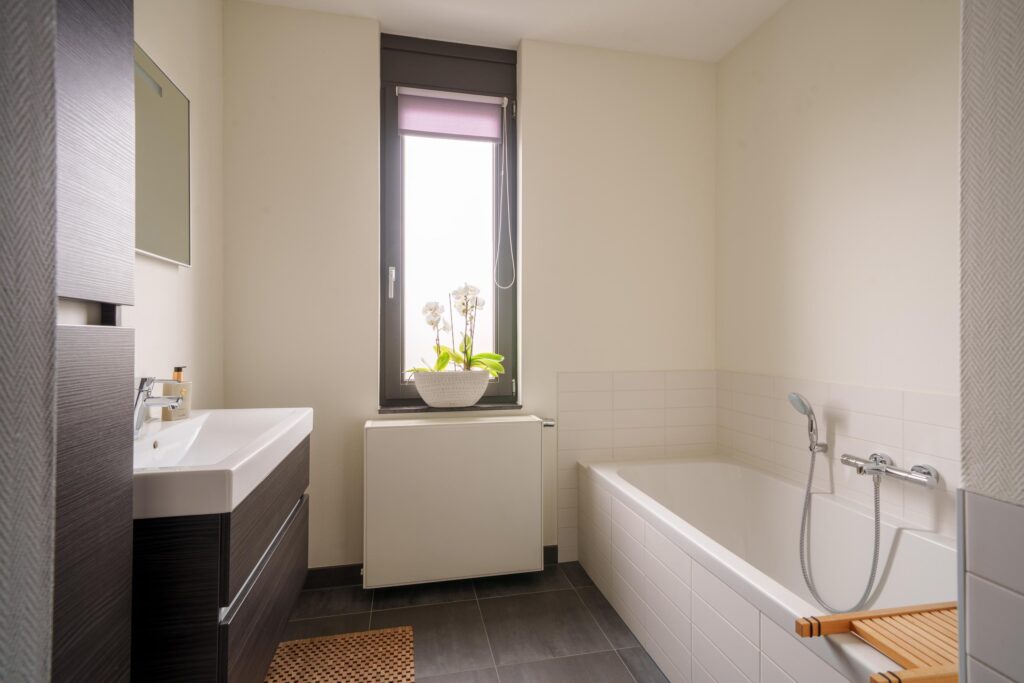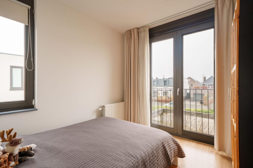 Ruime overloop met 2 slaapkamers, badkamer, aparte toiletruimte én wasruimte. De masterbedroom aan de achterzijde loopt over de volledige breedte van de woning en beschikt over 2 Franse balkons. De slaapkamer aan de voorzijde heeft ook een Frans balkon. De badkamer is voorzien van een royaal ligbad, een inloopdouche en een wastafelmeubel met spiegelverlichting. Alle slaapkamers zijn afgewerkt met glad gestuukte wanden en laminaatvloeren.