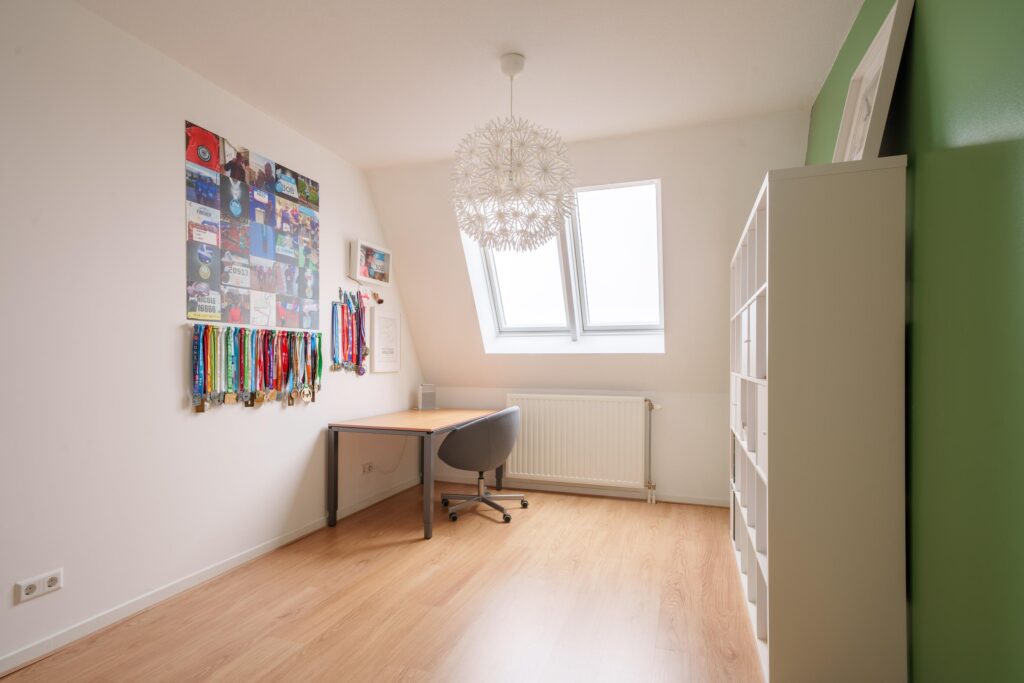 Overloop met berging en drie zeer ruime slaapkamers, waaronder de voorzijde over de gehele breedte van de woning. Ideaal voor werk-, hobby- of logeerkamers.