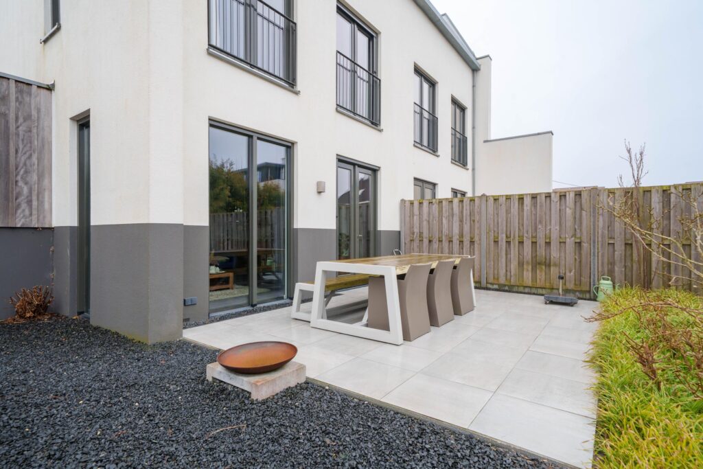• Zeer ruime achtertuin (ca. 150 m²) op het noordwesten met 3 terrassen, sierbestrating, gazon en veel privacy door hoge leibomen